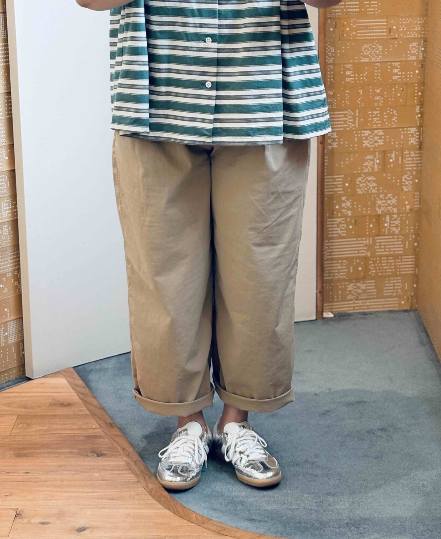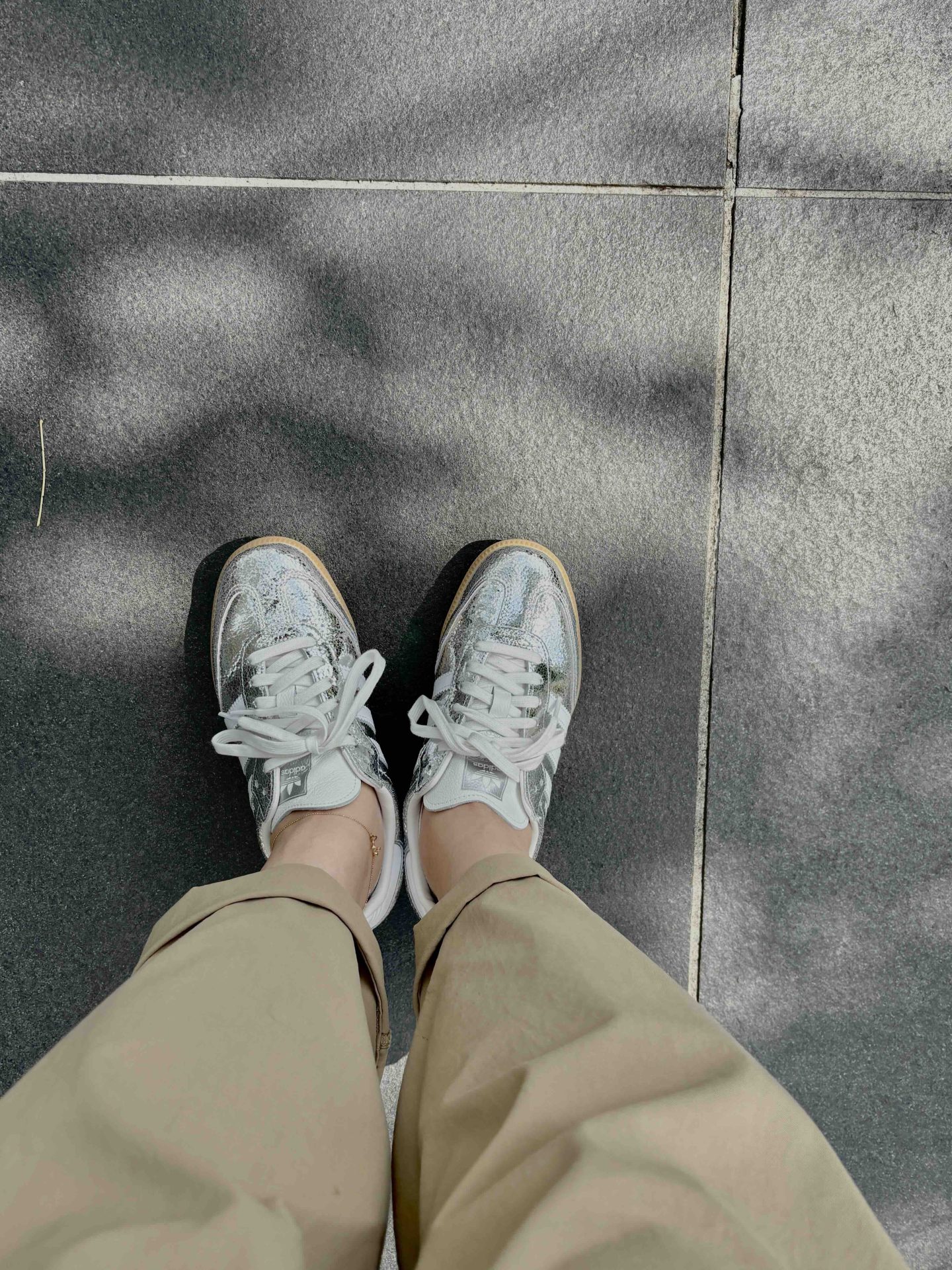 この日はワイドなチノパンに、ふんわりシルエットの柄ブラウスというコーディネート。こんな日にも、この“キラキラ”スニーカーがいい感じ。