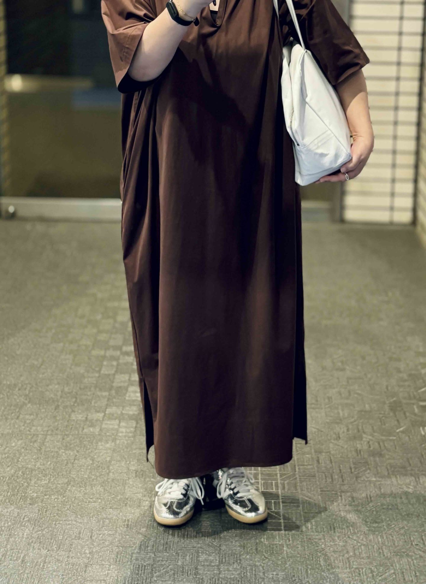 先ほどの写真のようなチノパン×ブラウスの日も、この写真のようなワンピにも違和感がないのが、このスニーカーのいいところ。「シルバー」の万能さ、伝わるでしょうか。