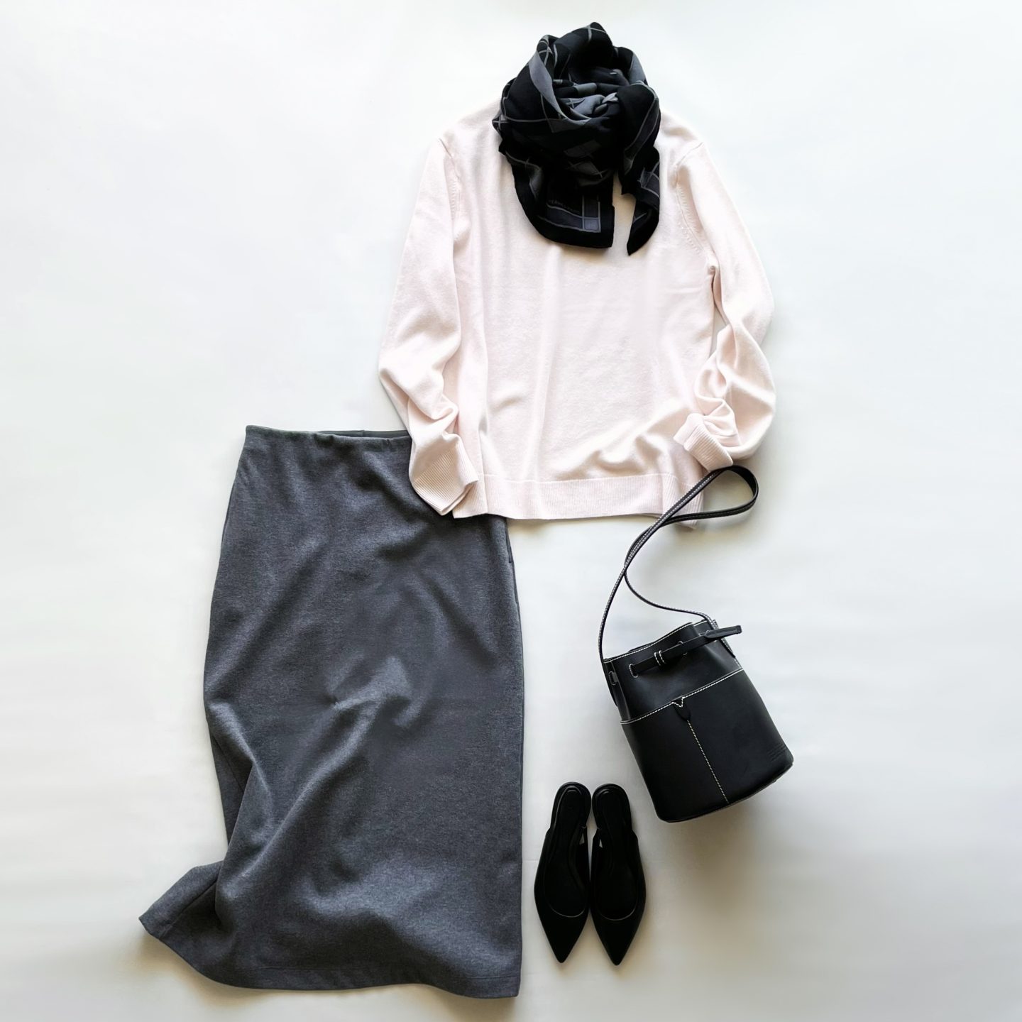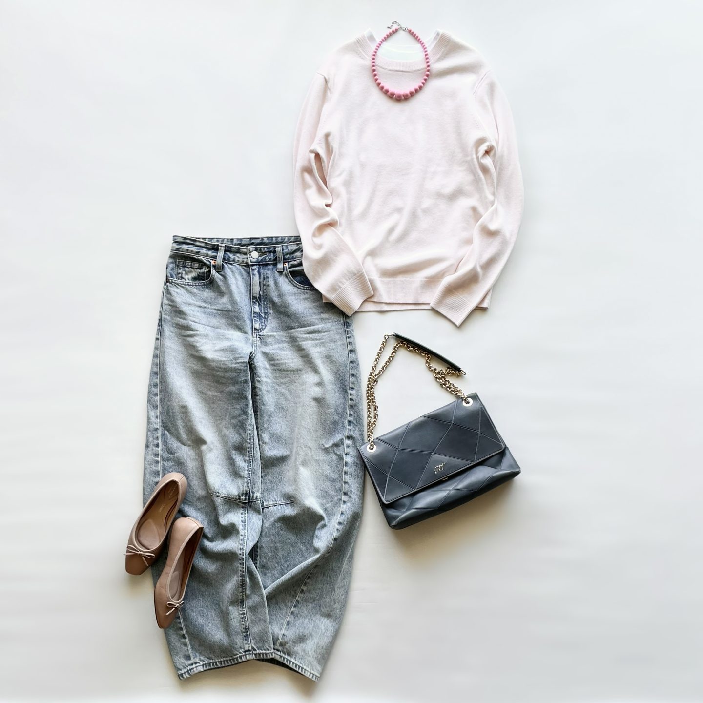 このコーディネートがしたくて、ピンクのニットを選んだといってもいいくらい。全体のトーンを統一させた、明るい色調の着こなしです。