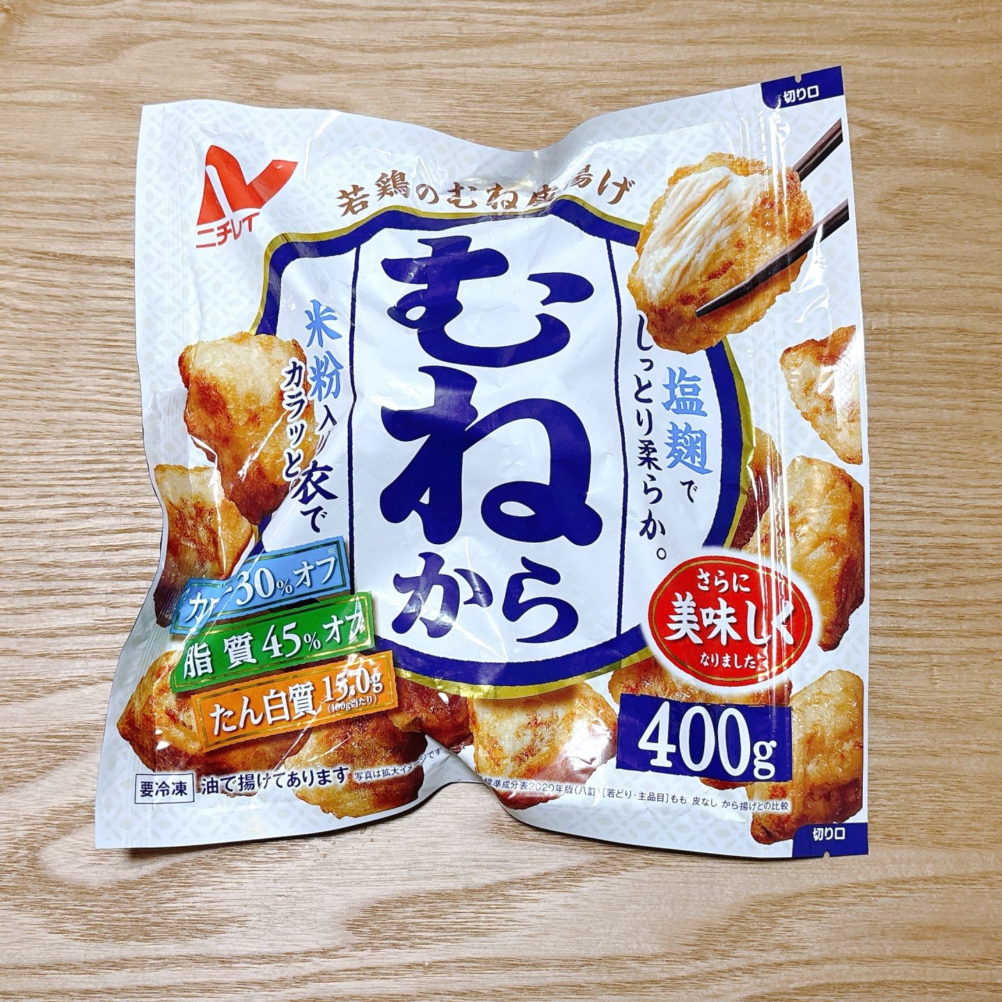 「むねから(R)」は、名前の通り鶏むね肉を使用した冷凍からあげ。高たんぱくでいてカロリーおさえめ、脂質も大幅にカットされています。むねからに出会ってから、ダイエット中でもからあげを我慢する必要がなくなりました。