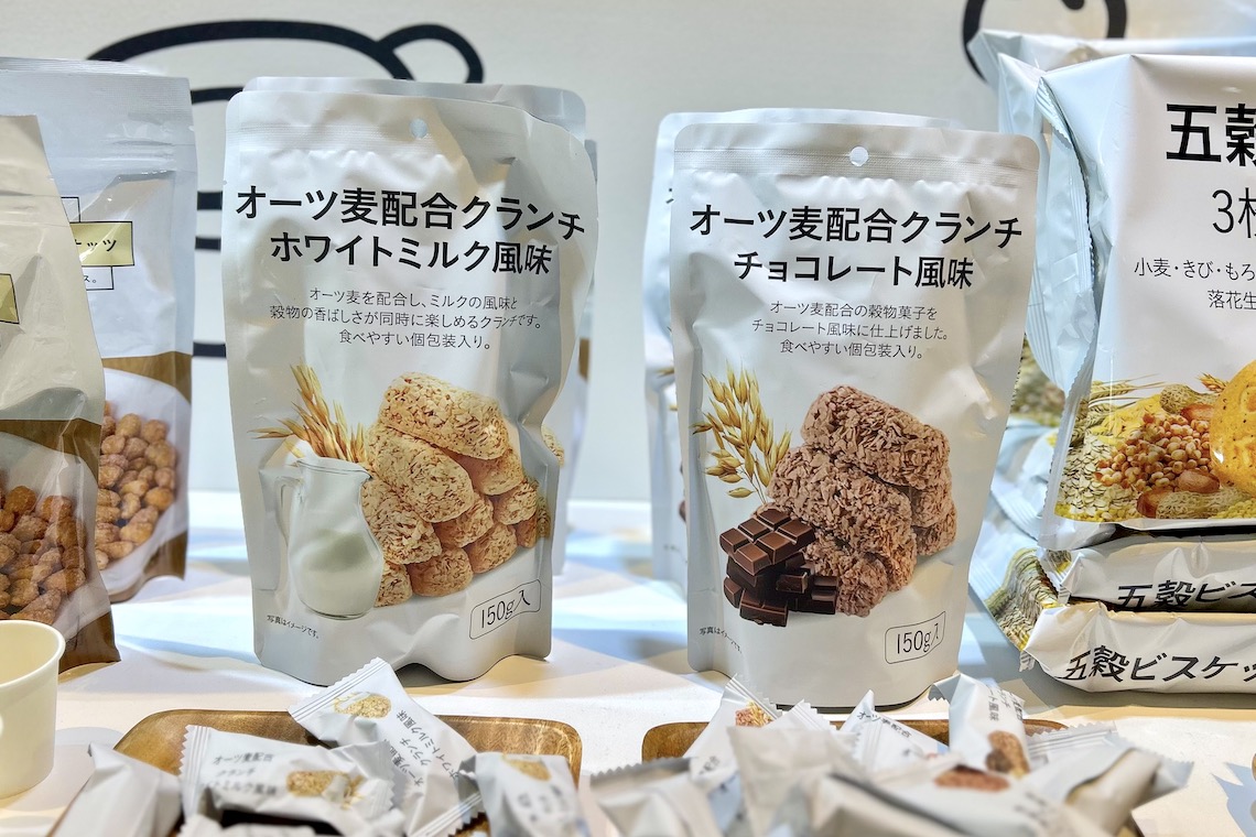 レトルトパウチの「むき栗」と「焼き干し芋」は、筆者の手元にあるもので2026年8月まで。「オーツ麦配合クランチホワイトミルク風味 150g」と「オーツ麦配合クランチチョコレート風味 150g」、「五穀ビスケット 3枚×10袋」は365日とのこと。