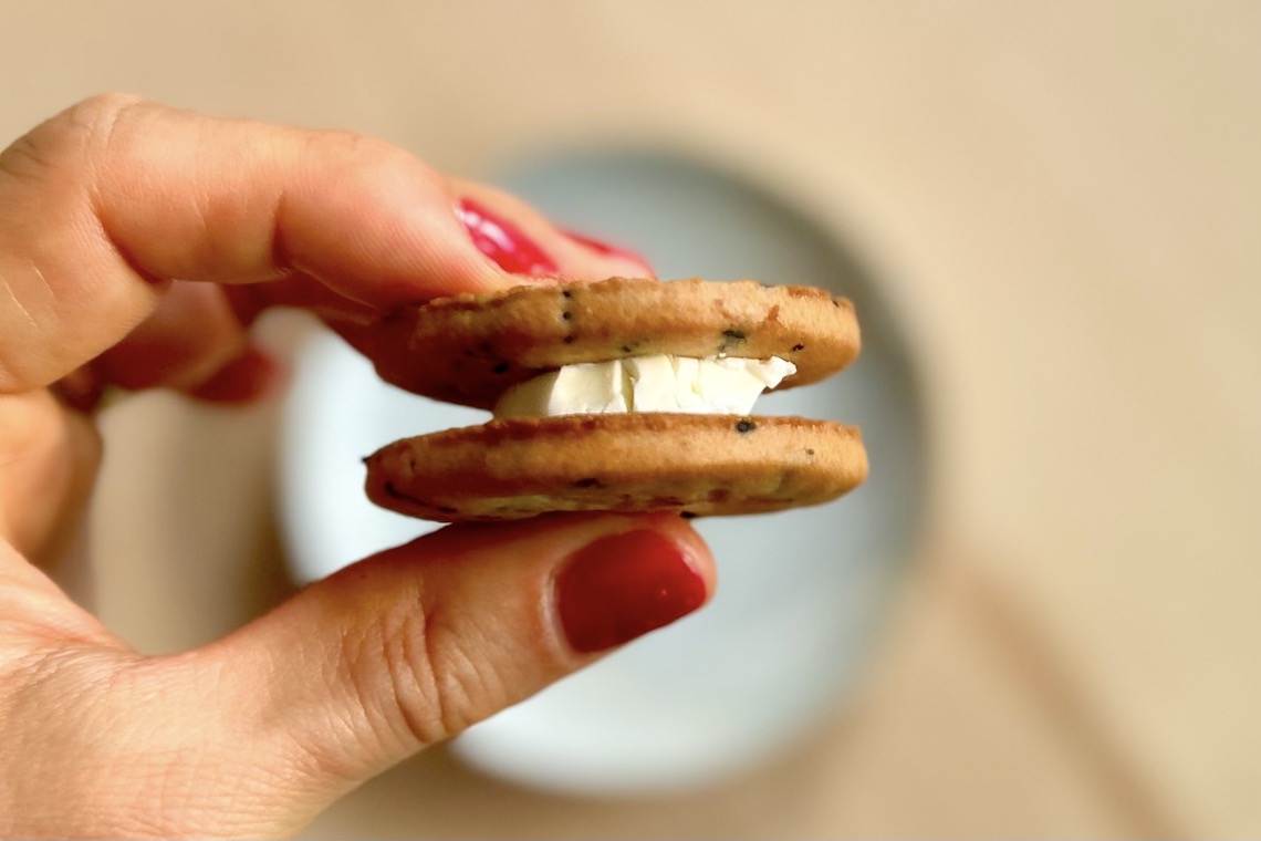 でもバイヤーさんのオススメは「バニラアイスを挟んでください」。わぁ、なんと悪魔的な! しょっぱいものが好きな筆者は「絶対に合うはず」とクリームチーズを挟んでみたら、大正解。乳製品のコクとさわやかな酸味が加わり、もう一袋開けてしまうところでした。