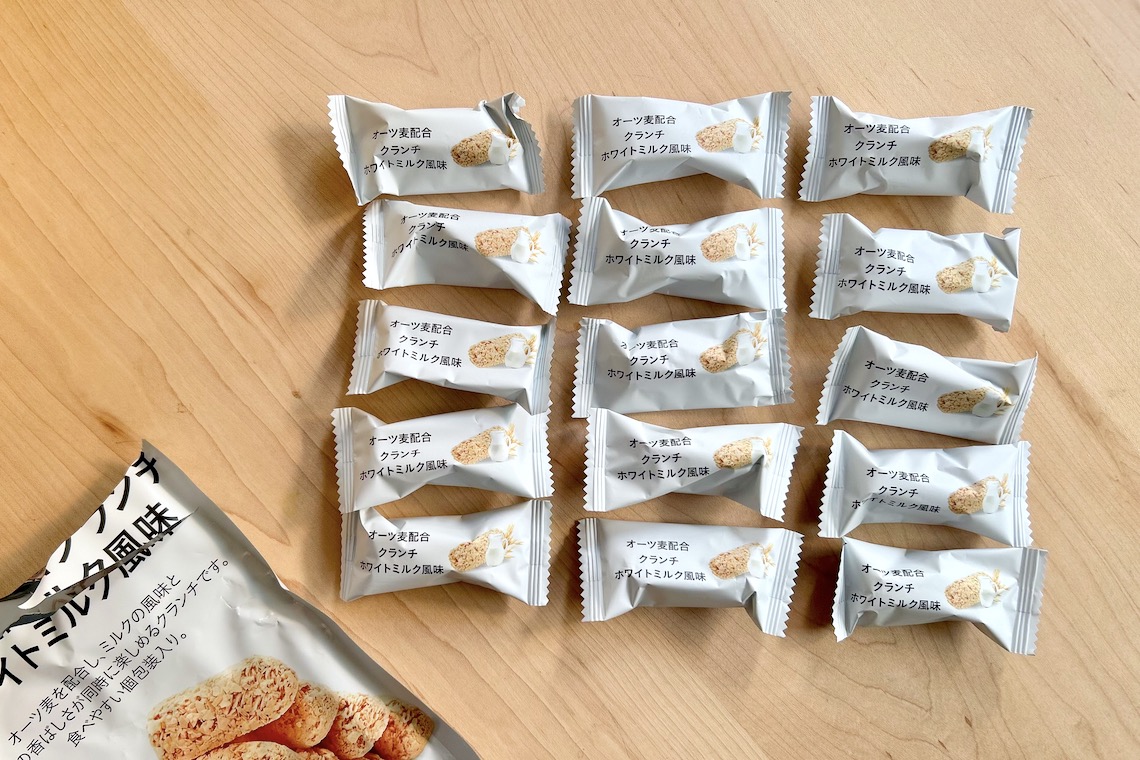 個包装で、袋に包んだまま食べられるので、デスクワーク中の小腹満たしとしても手が汚れません。