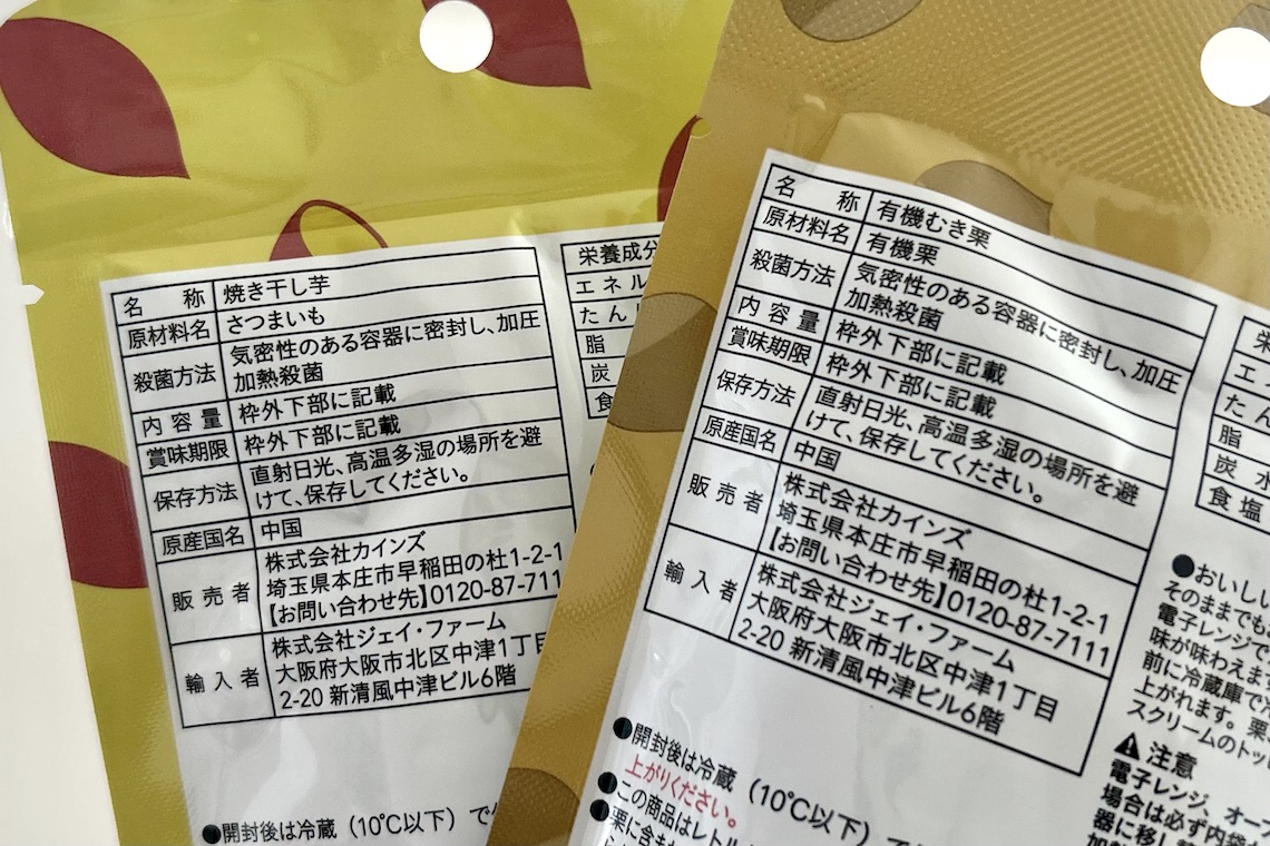 どちらも素材そのまま。「CAINZ 有機むき甘栗 50g×4パック」は100gあたり185kcal、「CAINZ 焼き干し芋 50g×4袋入」は100gあたり250kcal。