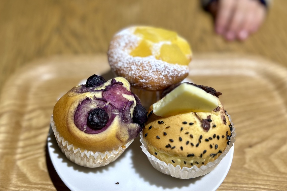 以前、筆者が娘と食べたマフィン。左から「ブルーベリーチーズ 糖質低減」「アップルカスタード」「あんバター」。