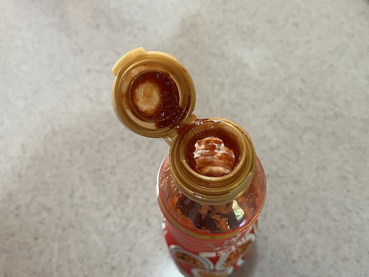 トマトソースはトロッとしたソースなので、キャップ部分に少し残ってしまいます。これはとろみのあるソースの宿命かもしれません。だんだんキャップが閉めにくくなりますし、ボトルの外側に垂れてしまうこともあるため、使った後は拭き取るようにしています。この部分はちょっと手間がかかるかもしれませんね。