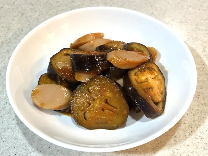 これはナスと魚肉ソーセージの炒め物。最後にトマトソースを加えて、さっと仕上げています。ナスにはすでに火が通っているので、味も染み込みやすいです。