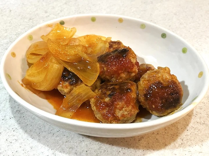 煮込みハンバーグをつくりました。ハンバーグを焼いた後、トマトソースを使ってスープを作り煮込んでいます。これまではトマト缶やコンソメを使って味付けをしていたので、トマトソースだけで仕上がるのでとっても楽。筆者は水分を飛ばしましたが、そのままスープを残してもおいしくいただけます。