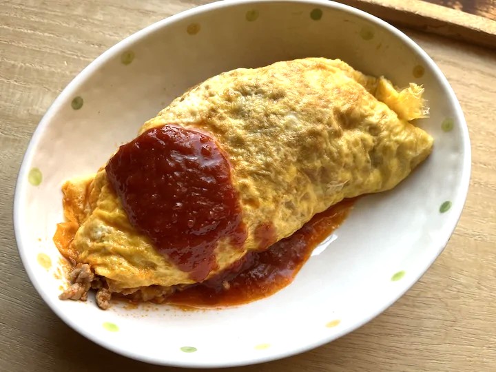 オムレツです。中に入っているのは豚ひき肉をトマトソースで炒めたもの。卵を薄く焼いて、味付けした豚ひき肉を包みました。仕上げにトマトソースを卵にかけています。ケチャップの代わりに使えますが、コクがあるのでソースとしても優秀です。