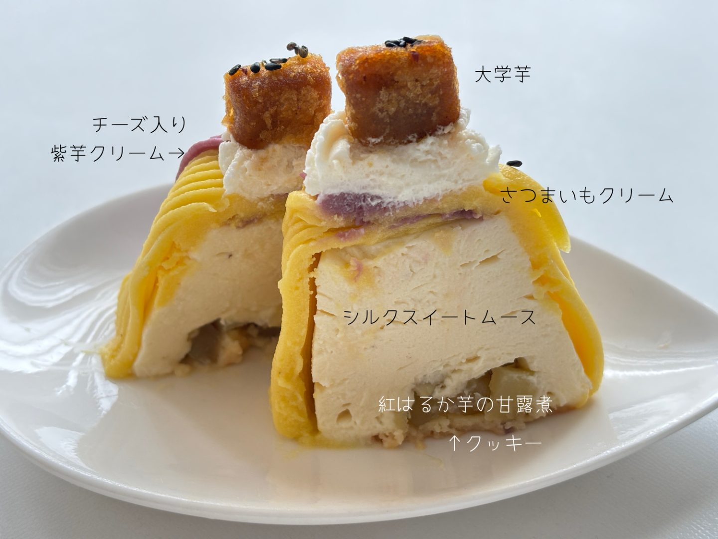 底にはしっとりスポンジ、その上にシルクスイートのムースが層をなし、中には紅はるかの甘露煮がごろっと入っています。