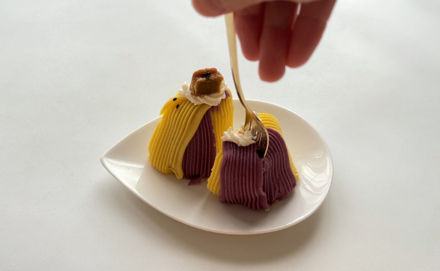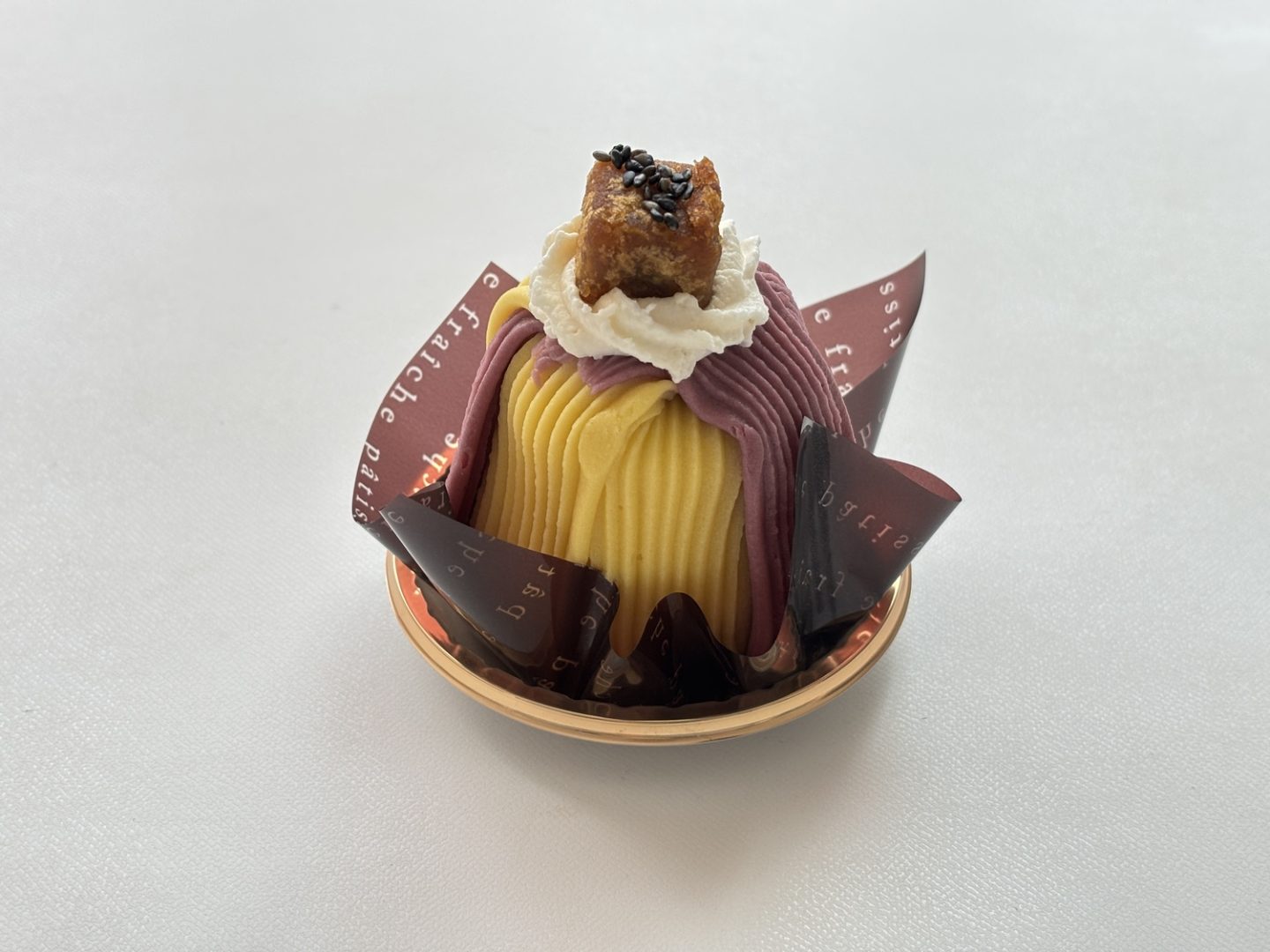 外側は、さつまいもクリームとチーズ入り紫芋クリームの2色のモンブランクリームで包まれ、トップには大学芋のダイスがキラリ。