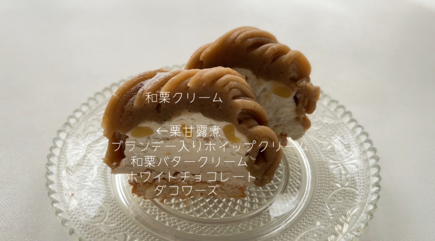 底は香ばしいダコワーズ生地、その上にホワイトチョコレートが薄く敷かれ、さらに栗の甘露煮、和栗バタークリーム、和栗ペーストクリームが重なります。