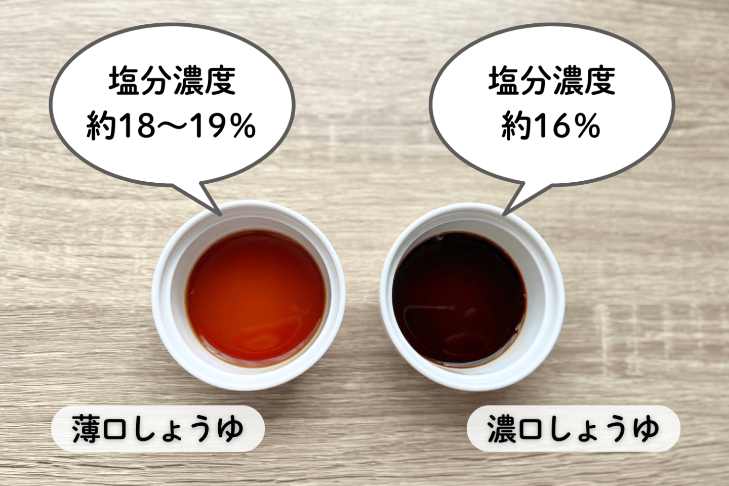 ただし、塩分濃度は名前とは逆で、濃口しょうゆは約16%、薄口しょうゆは約18〜19%と、濃口しょうゆの方が塩分は控えめになっています。