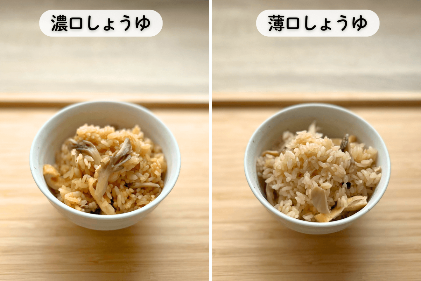 薄口しょうゆ、濃口しょうゆで炊いてみると、色の違いが歴然です。この時、薄口しょうゆの方が塩味が強いので、やや控えめに入れてください。夏場にとうもろこしごはんを作る時なども、薄口しょうゆで作るときれいですよ」