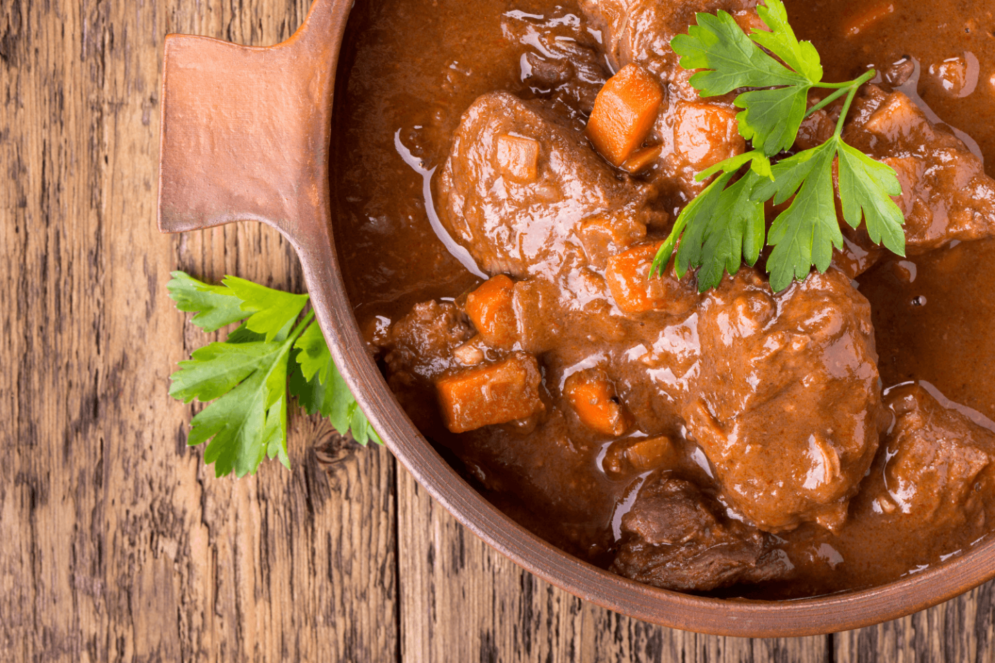 牛肉・タマネギ・ニンジンなどをブラウンソースで長時間煮込んだ料理。