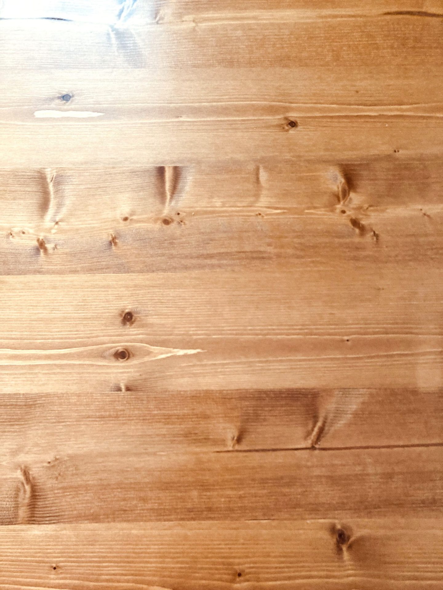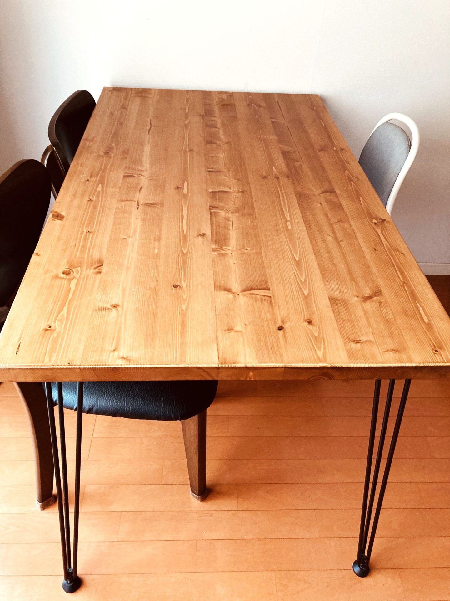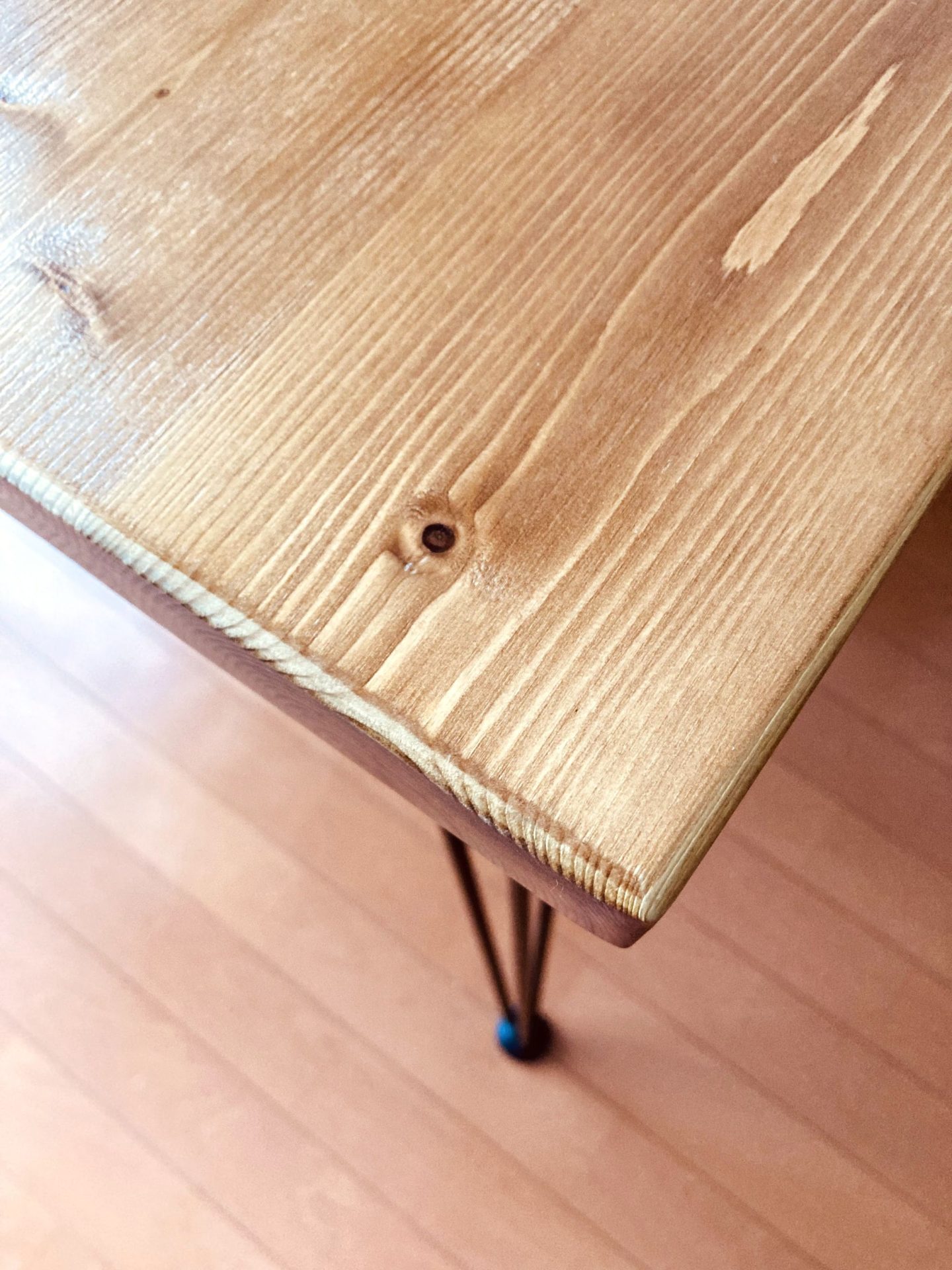 天板はヴィンテージ加工が施されているので、新品のパイン材でありながら落ち着いた雰囲気になっています。パイン材は経年変化を楽しめる木材ではありますが、2年半を経たいま、購入時に比べて色が少し濃くなり、ヴィンテージ感が増してきたように感じます。