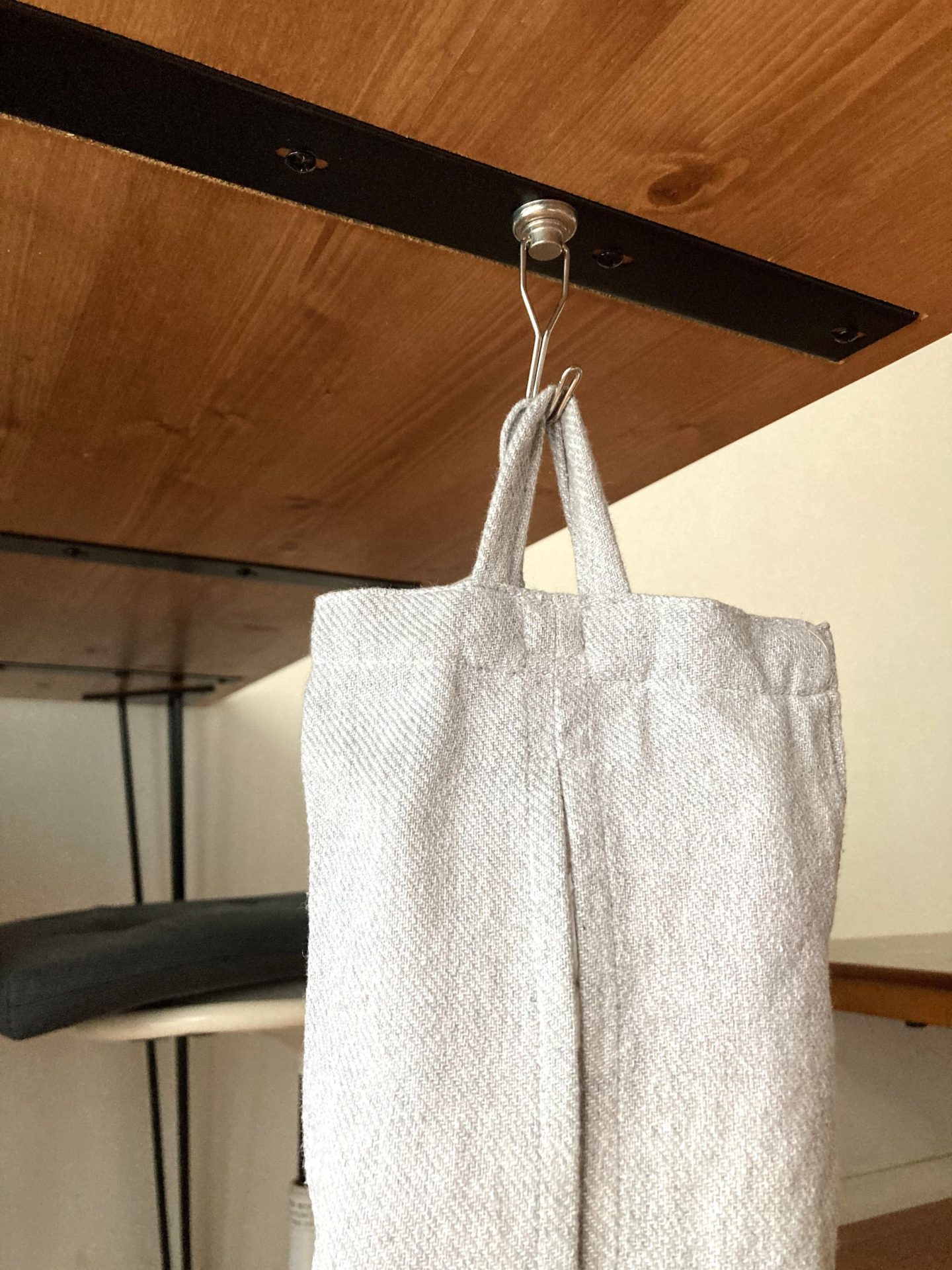 天板の裏には、スチールの反り止めが3本施されているのですが、これが裏面の“隠し収納”にぴったりなんです。