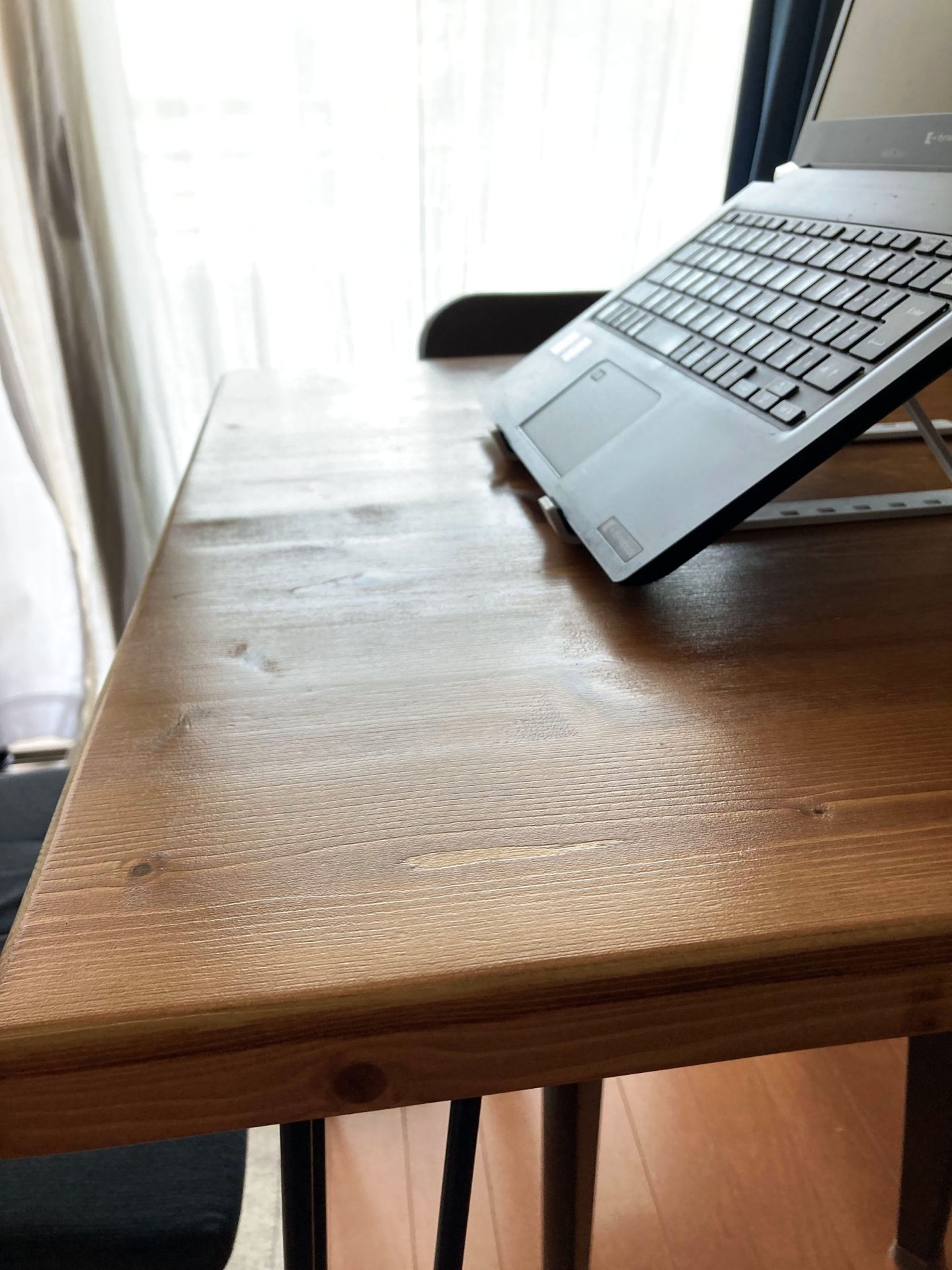 一般的な国産のダイニングテーブルに比べて、少しだけ高さがあるように感じています。しかしそれが幸いして、食事だけではなく、パソコン作業や勉強にも向いています。実際に、ワークデスクとして使う人も多く、LOWYAのオフィスデスクにも採用されているとか。