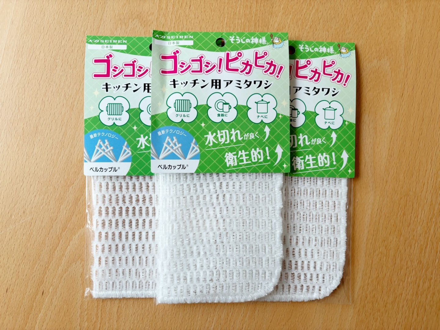 我が家のキッチングッズの愛用アイテムと言えばそうじの神様のキッチンアミタワシ。