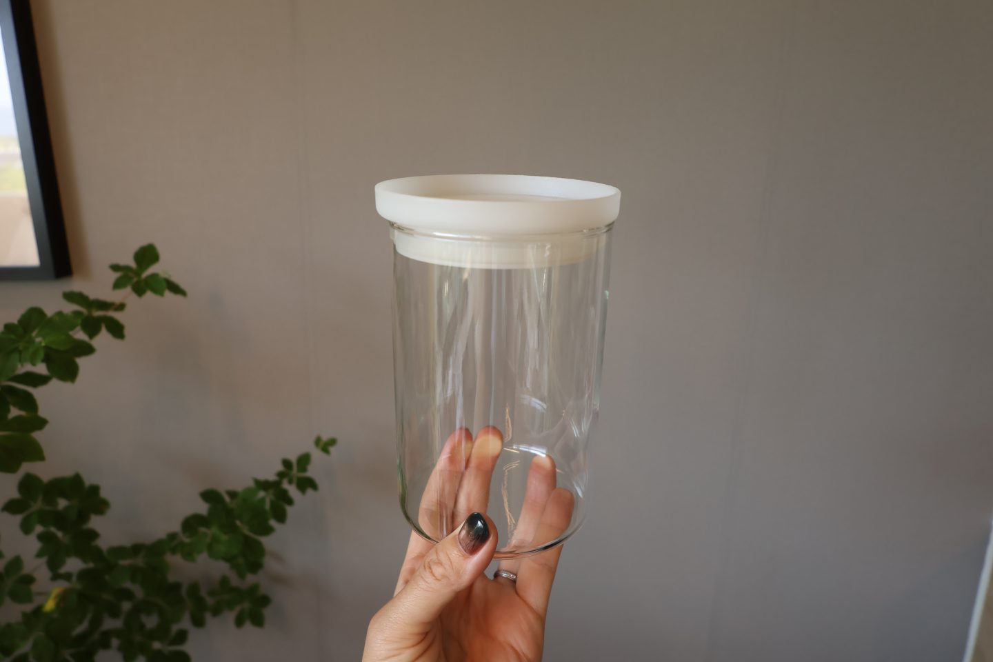 愛用しているのは、子育て前から愛用している『無印良品』の「耐熱ガラス丸型保存容器」です。口が広くて洗いやすく、耐熱ガラスなのでお手入れもしやすい上に、劣化もしにくく、長く愛用できています。