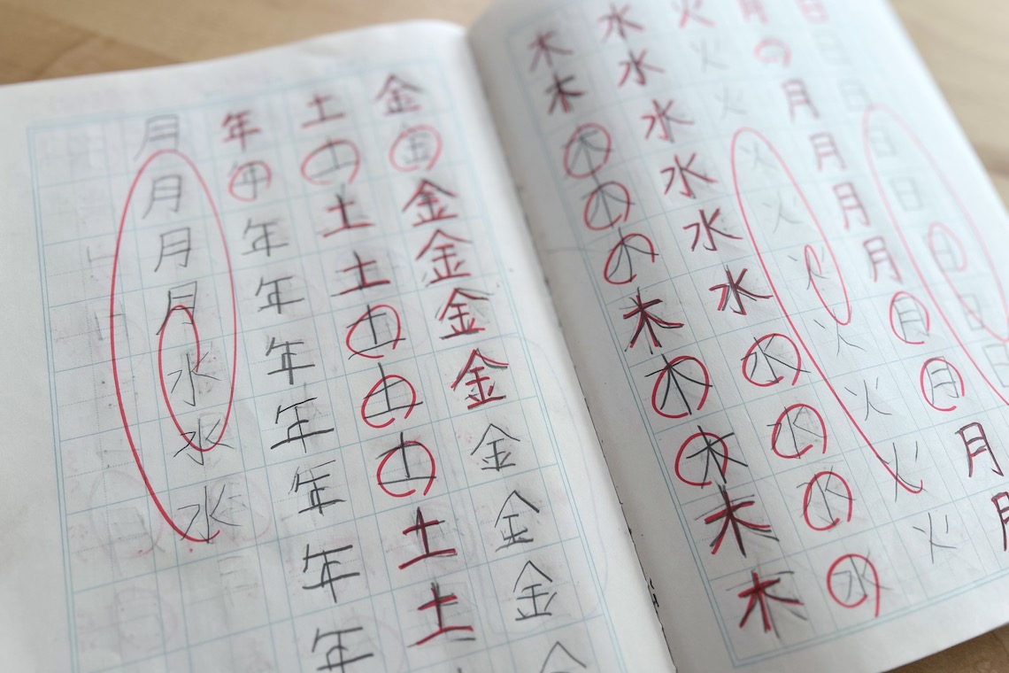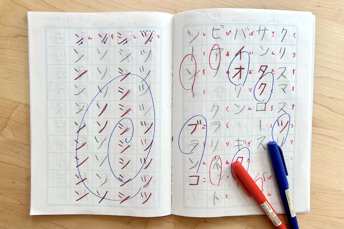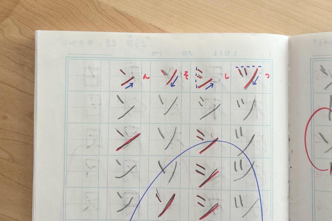 わが子に文字を教えはじめて改めて気づきましたが、トメ・ハネ・はらいが正しくないとちがう文字に見えてしまうんですね。学校のテストで、何度くやしい思いをしたか……。だからこの赤ペンで、書き順はもちろん、トメ・ハネ・はらいもビシビシ指導しています。