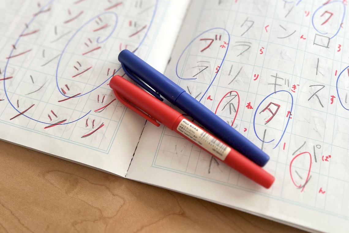 出会って以来、宿題のマルつけにはじまり、なぞり書きのお手本を書いたり訂正したりと、毎日朝晩酷使しています。しかしまだ1本目が現役。筆圧がそこまで強くないからか? ペン先もヘタる様子がありません。