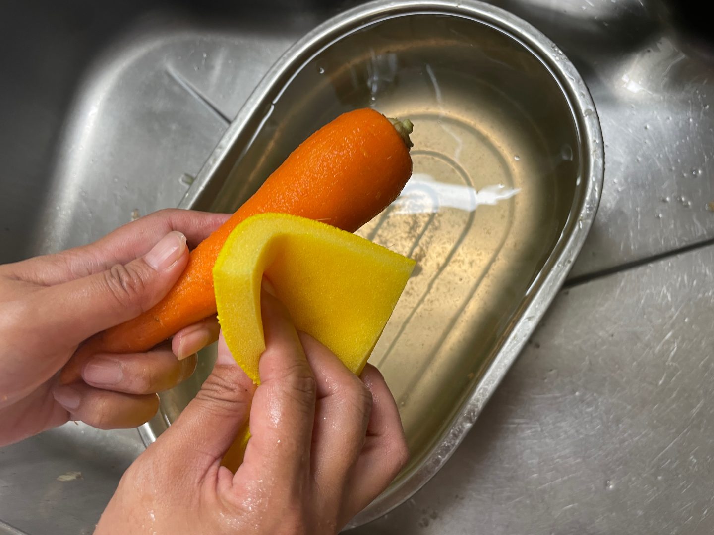 実際に家でにんじんの皮をこちらのスポンジで剥いてみました。左が皮を剥く前で、右がスポンジで皮を剥いた後。どうでしょうか? 見事に限りなく薄く剝けています! しかもこのスポンジで剥くと、皮のゴミがほとんど出ないのも大きなポイント。生ごみも減るし、本来食べられる皮のフードロスも最小限にすることができちゃいます。にんじん以外でももちろんじゃがいもやごぼうでもOK。ただしごぼうはスポンジについた皮の汚れが落ちにくいのが欠点。ごぼう専用のスポンジにするのも手かもしれません。