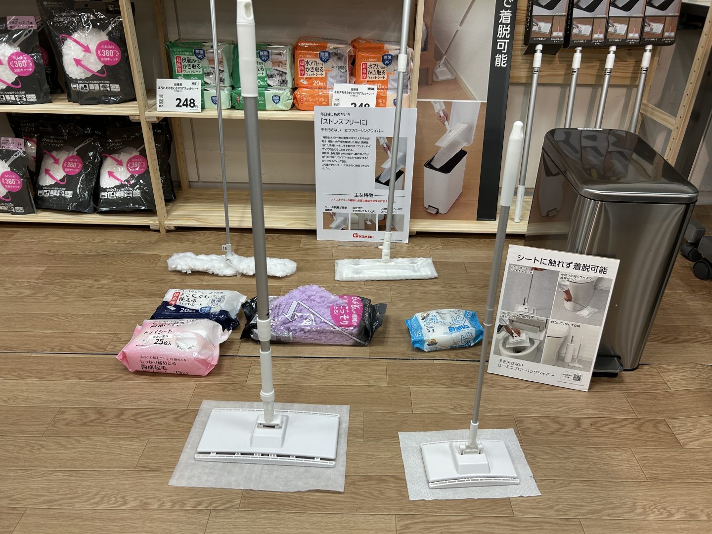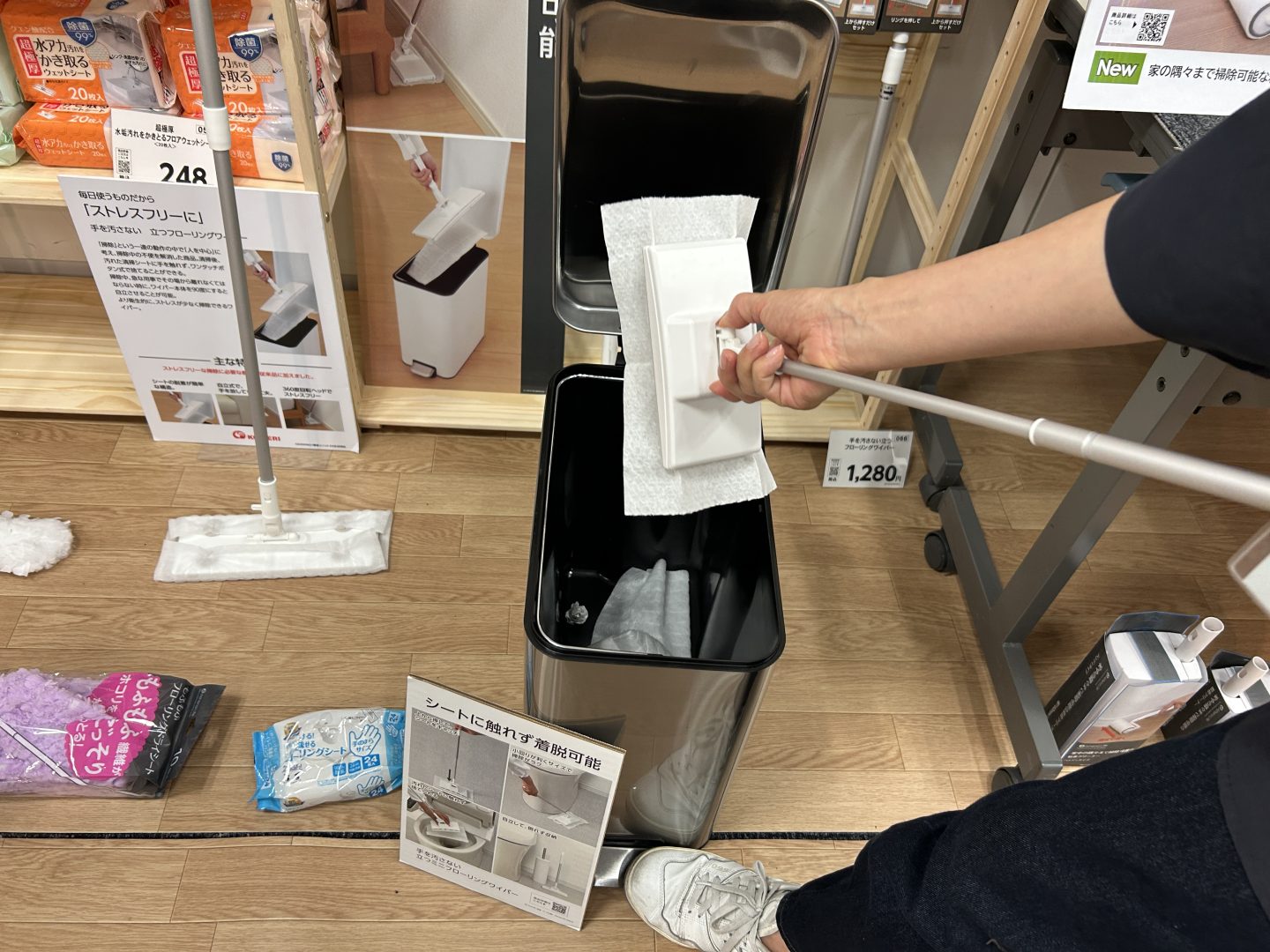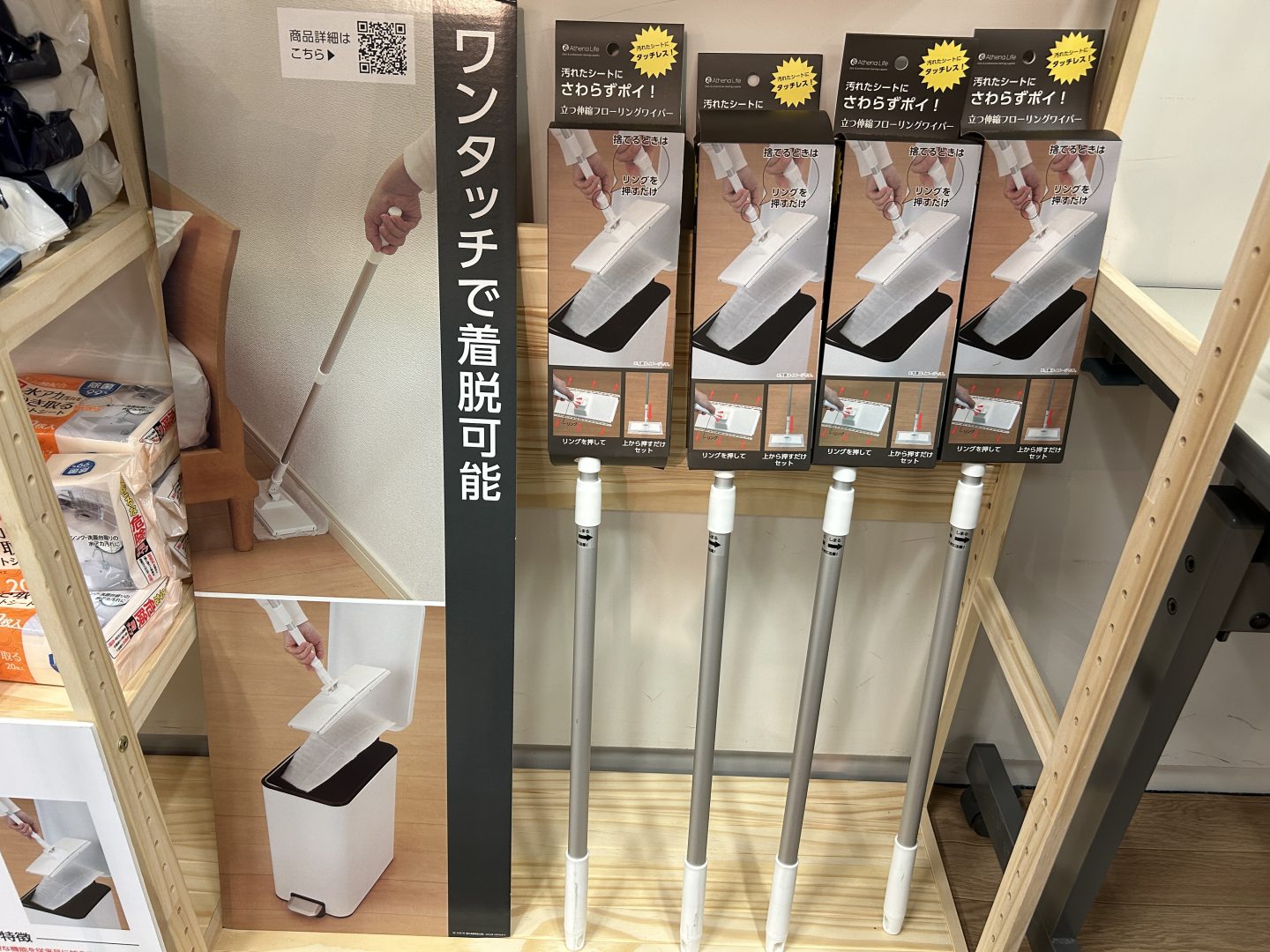 こちらは『コメリ』のインテリア・生活雑貨のプライベートブランド「Athena Life(アテーナライフ)」の新製品。いわゆるフローリングワイパーなのですが、シートを手に触れることなく着脱することができるのが最大の特徴。しかも自立もするのです。