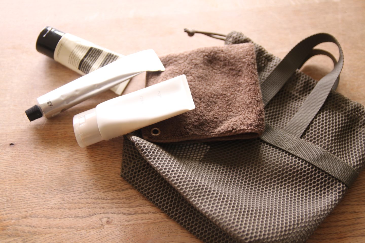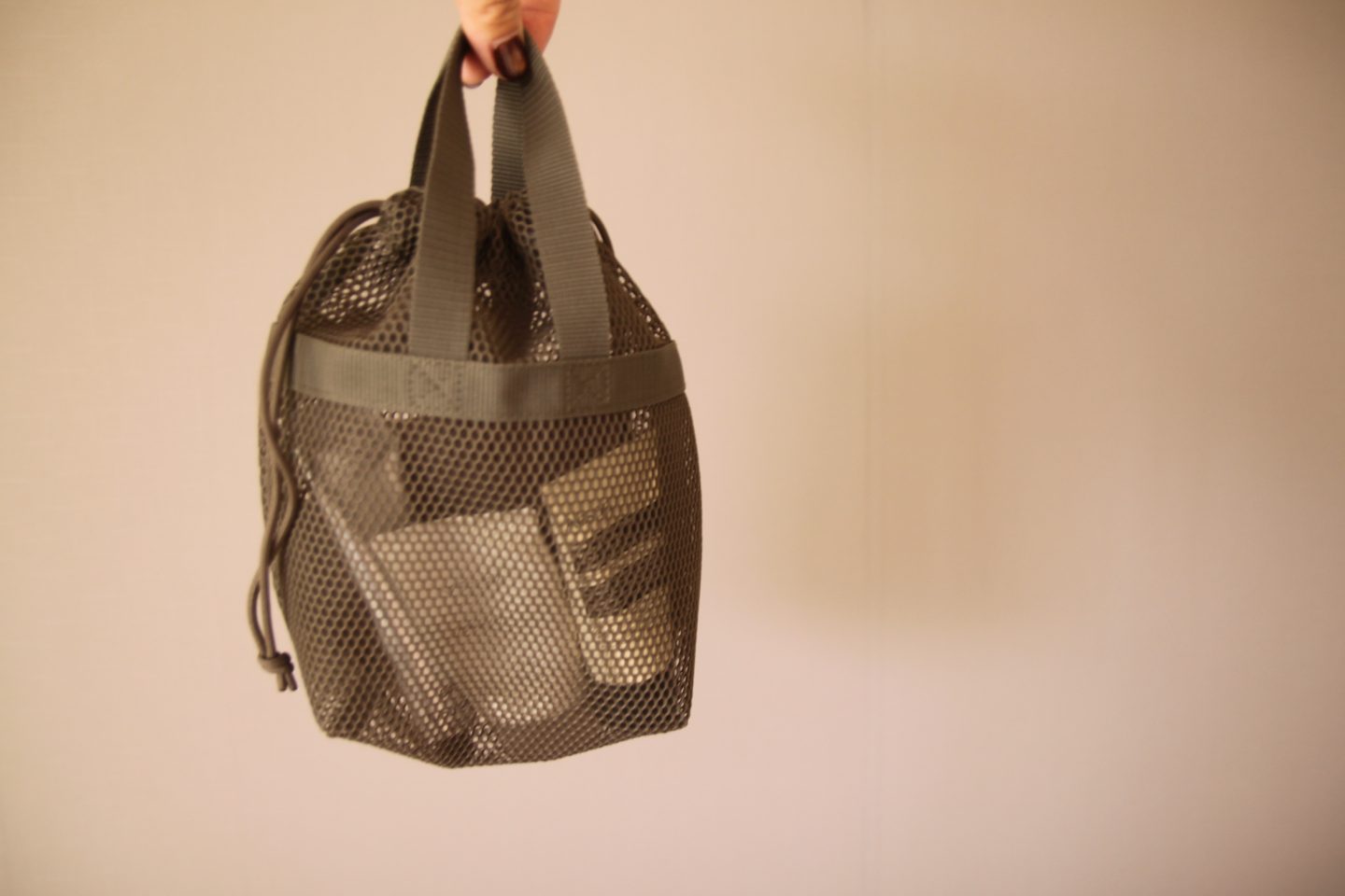 『無印良品』の「立体メッシュ持ち手付き巾着 」(990円・税込)は、大好きなメッシュシリーズの中でもしっかりとした硬さがあって、マルチに使えるアイテム!