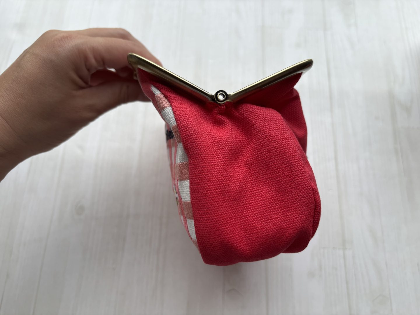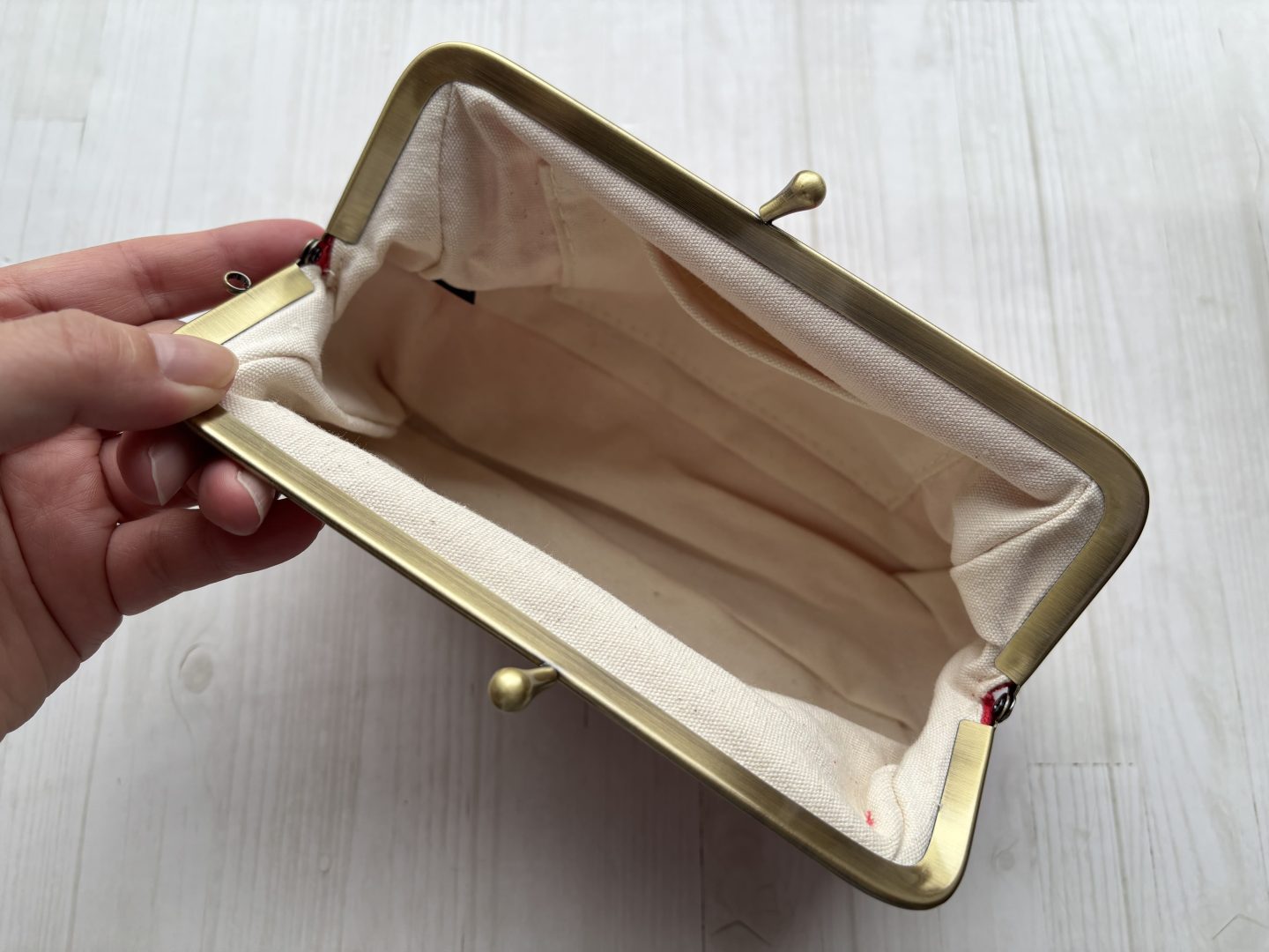 がま口タイプなので片手で開けられますし、かつ大きく開くタイプなので中身を出し入れしやすいんです。