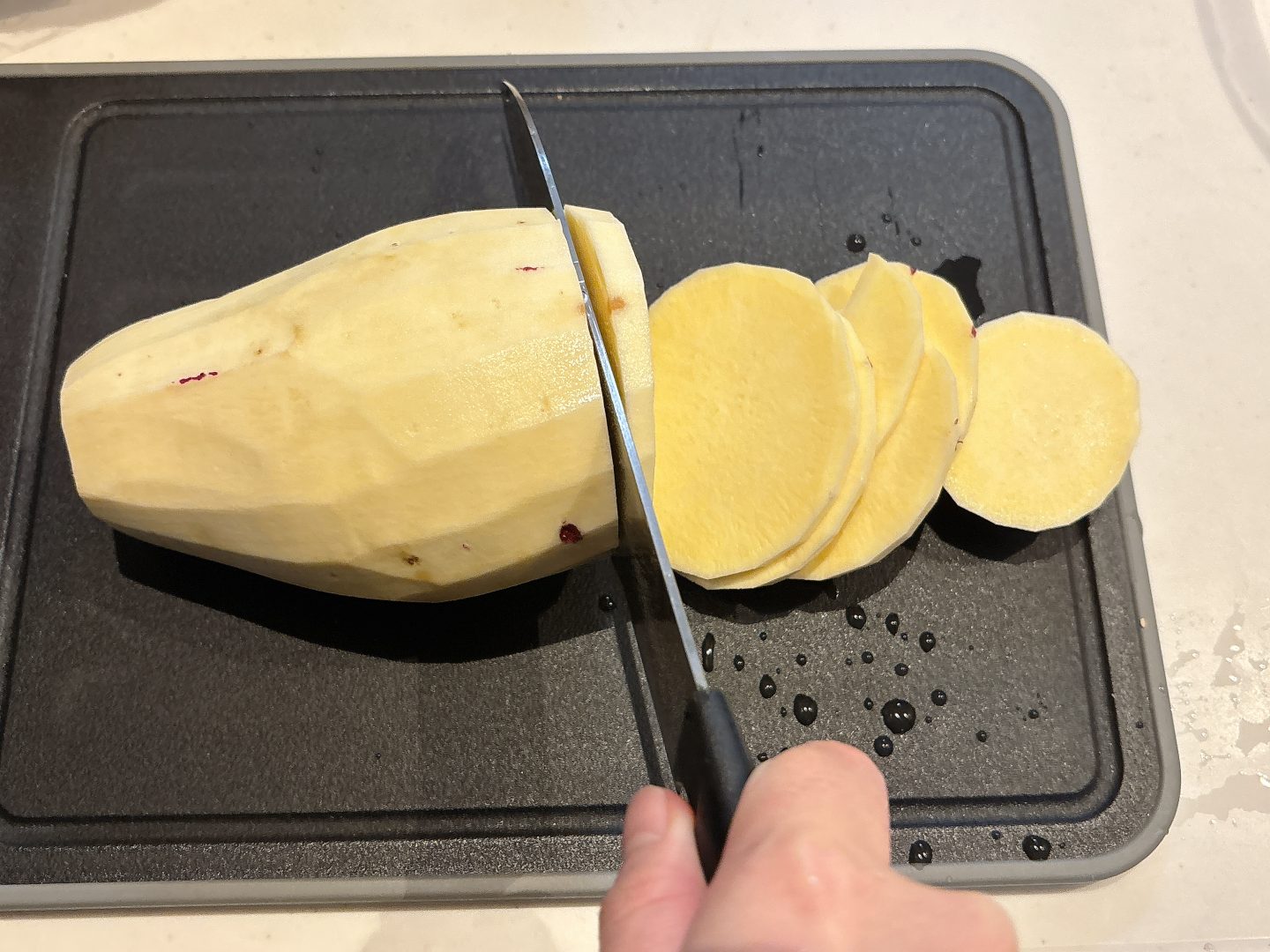 固いさつまいもを切っても、刃をしっかり受け止めてくれました。今のところ包丁の跡もそれほどついていないので、長く使えそうです。