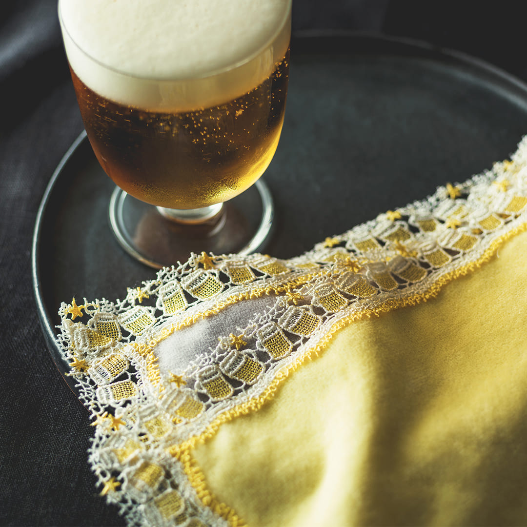 「将棋以降、模索しながらさまざまなモチーフを出してきましたが、やはり『ビール』は印象に残っています。2021年8月から出し始めたモチーフですが、初期の頃はジョッキに入ったビールと一緒に『ハッピーアワー』という文字を刺繍していたんです。それを社長である兄が、この文字を『とりあえず』、にしてはどうか』というアイディアを出したのです。