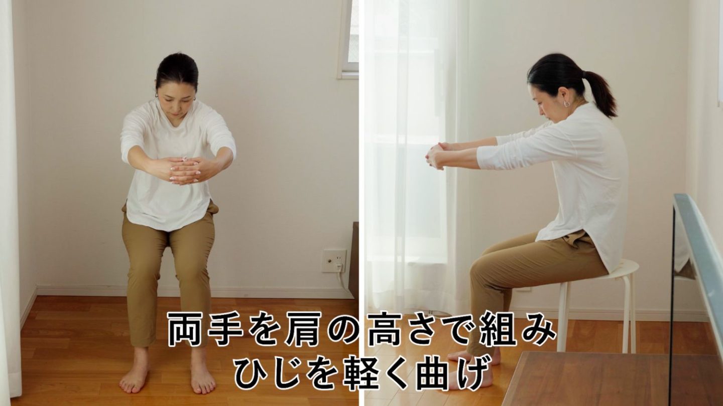 両手を肩の高さて組み、ひじを軽く曲げ、腕は前に伸ばしたまま背中を丸めます。大きなボールを抱えるイメージで。