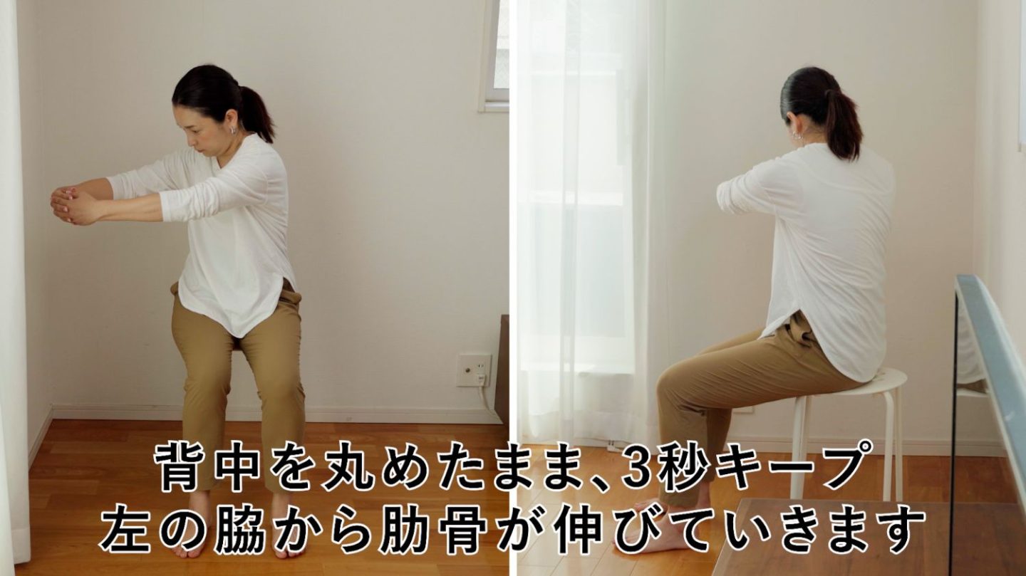 次に、腕はそのまま上半身を右に大きくひねります。背中を丸めたまま、3秒キープ!