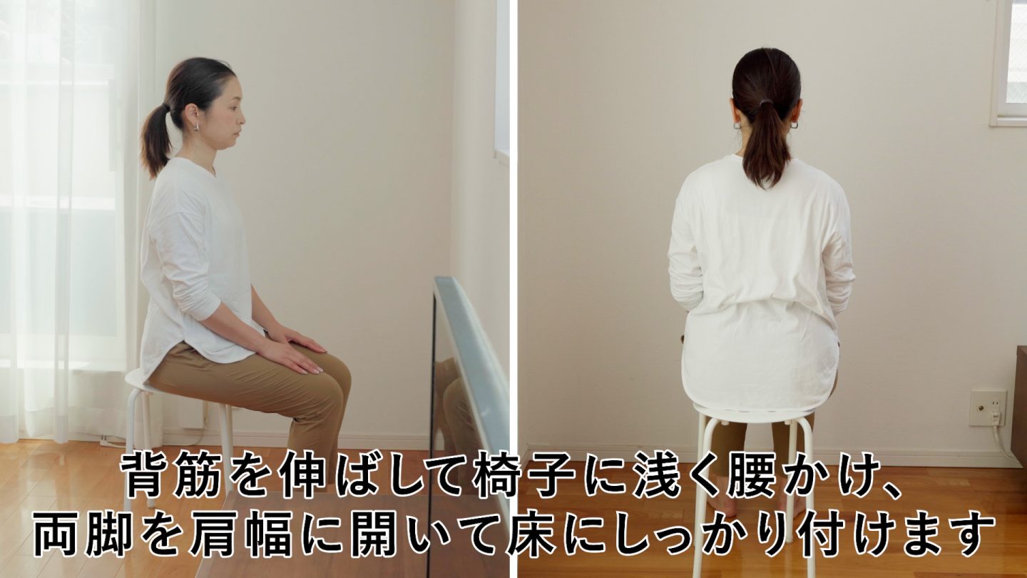 背筋を伸ばして椅子に浅く腰かけ、両脚を肩幅に開いて床にしっかり付けます。
