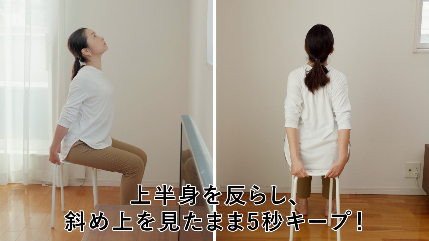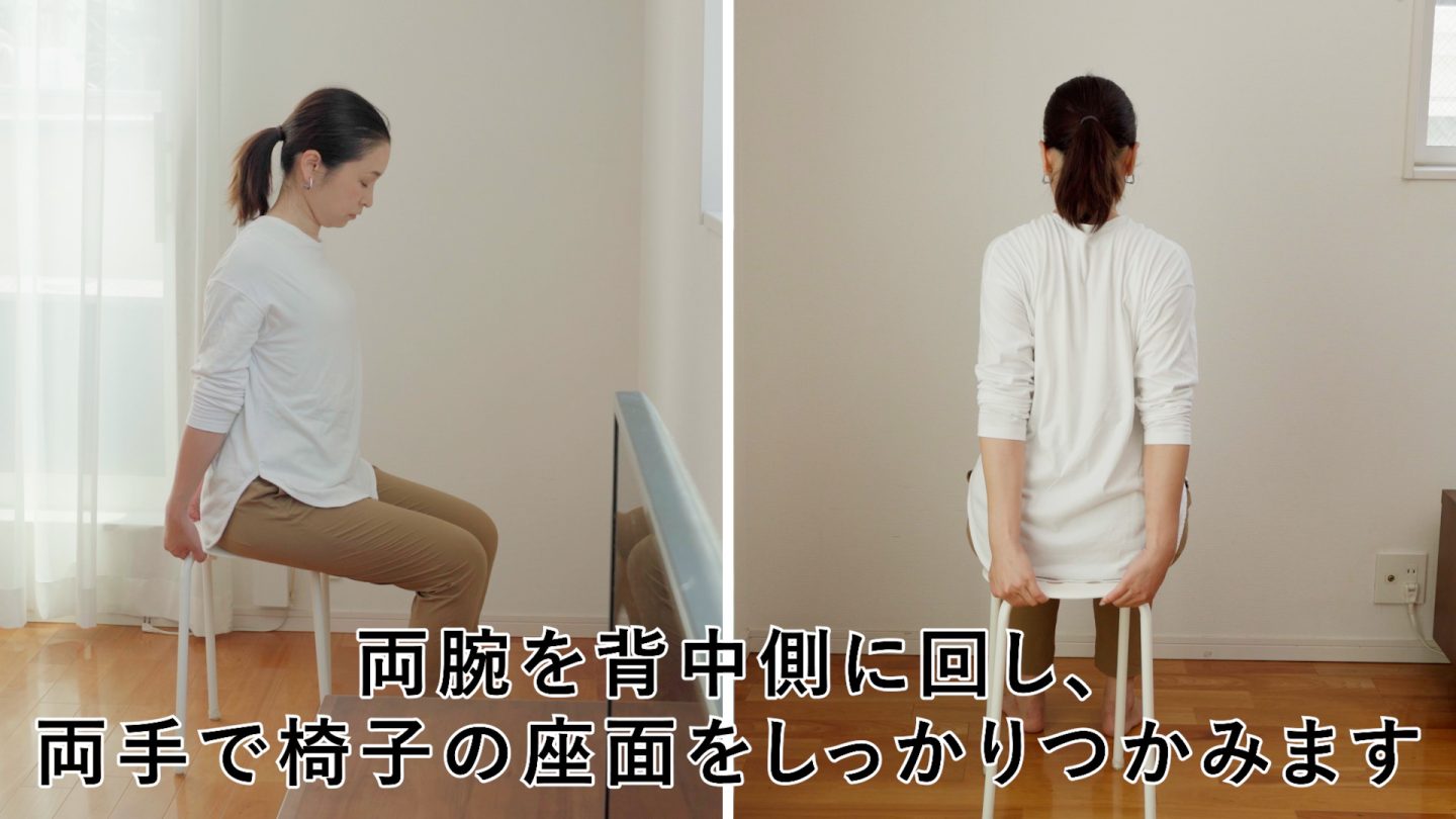 両腕を背中側に回し、両手で椅子の座面をしっかりつかみます。