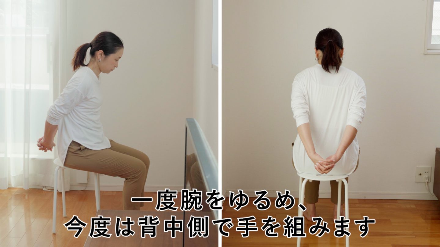 一度腕をゆるめ、今度は背中側で手を組みます。