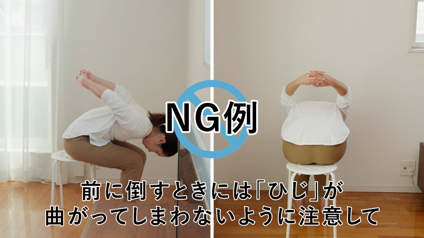 前に倒すときには「ひじ」が曲がってしまわないように注意してください。「腕全体」を伸ばしながら倒すことで、肩甲骨周りにしっかり効きます。