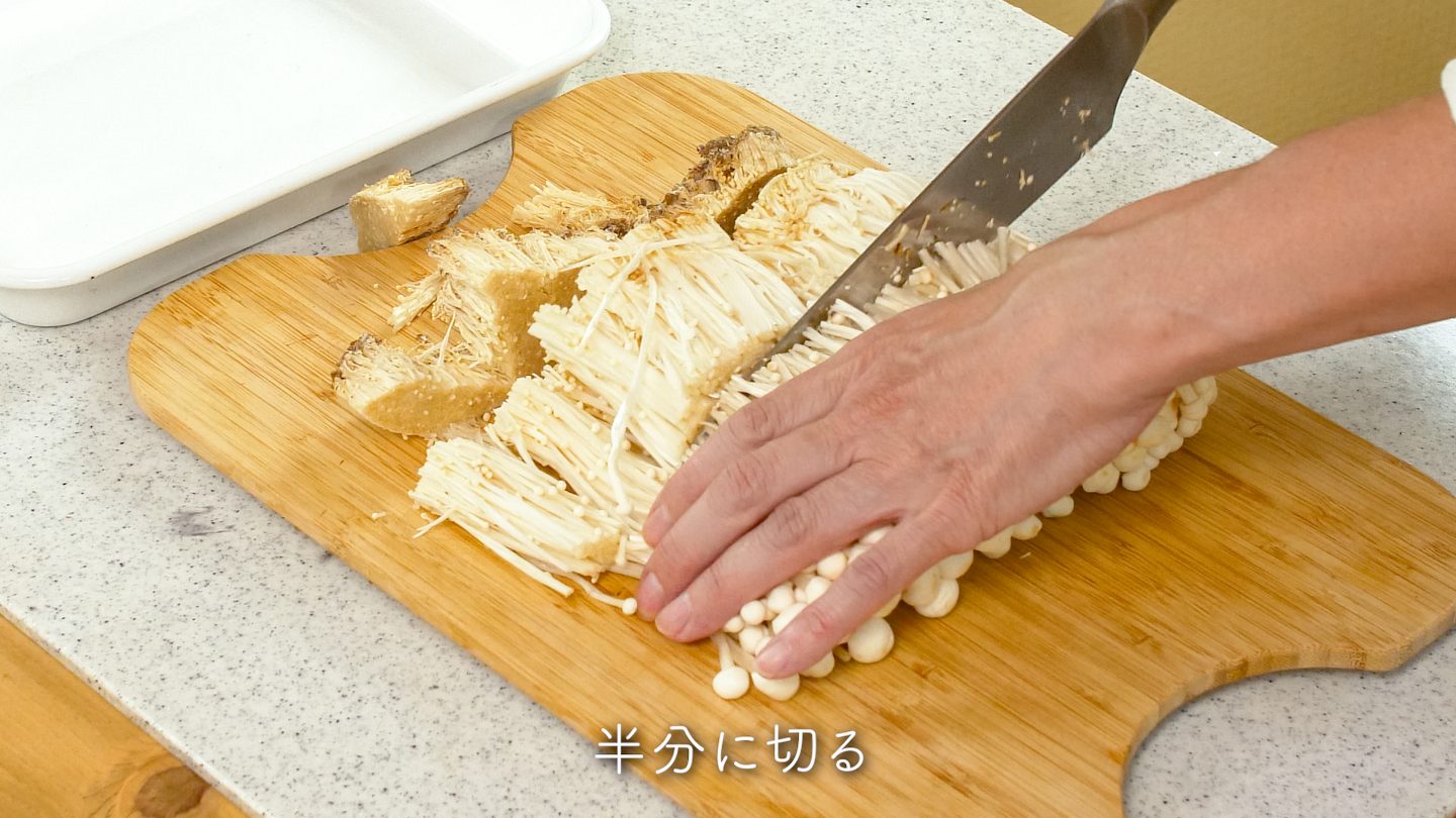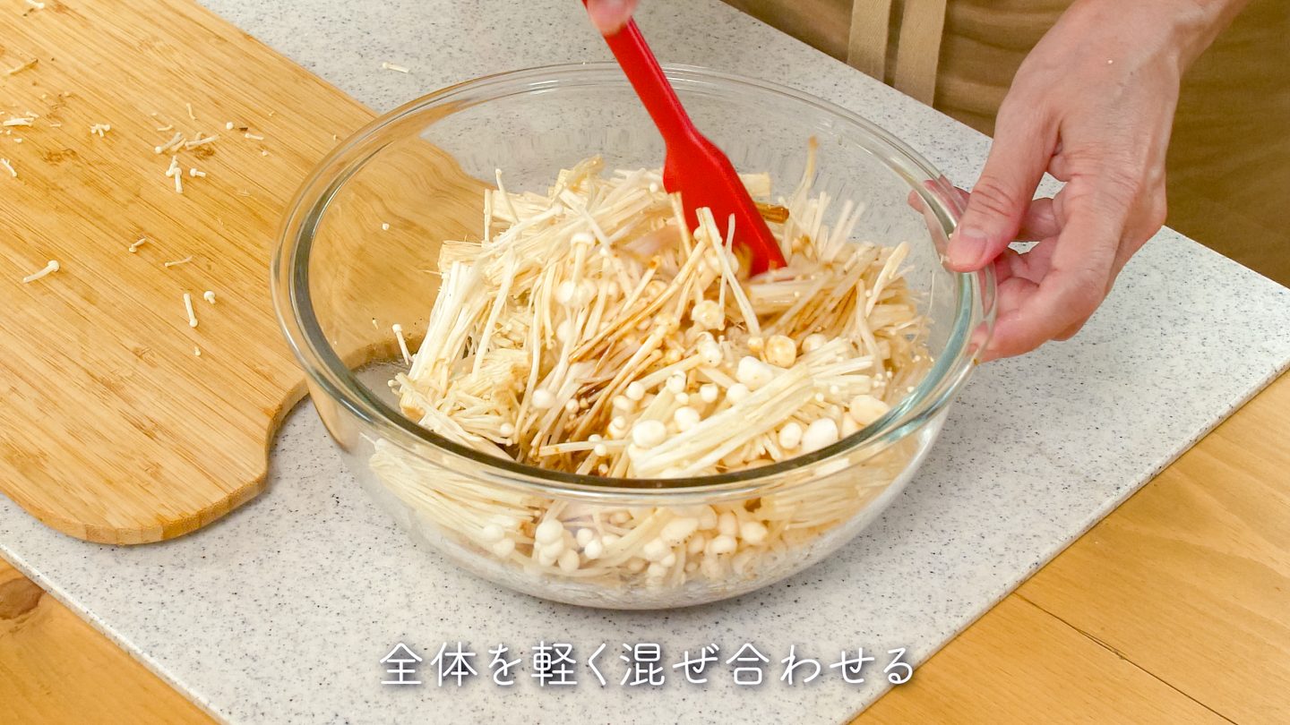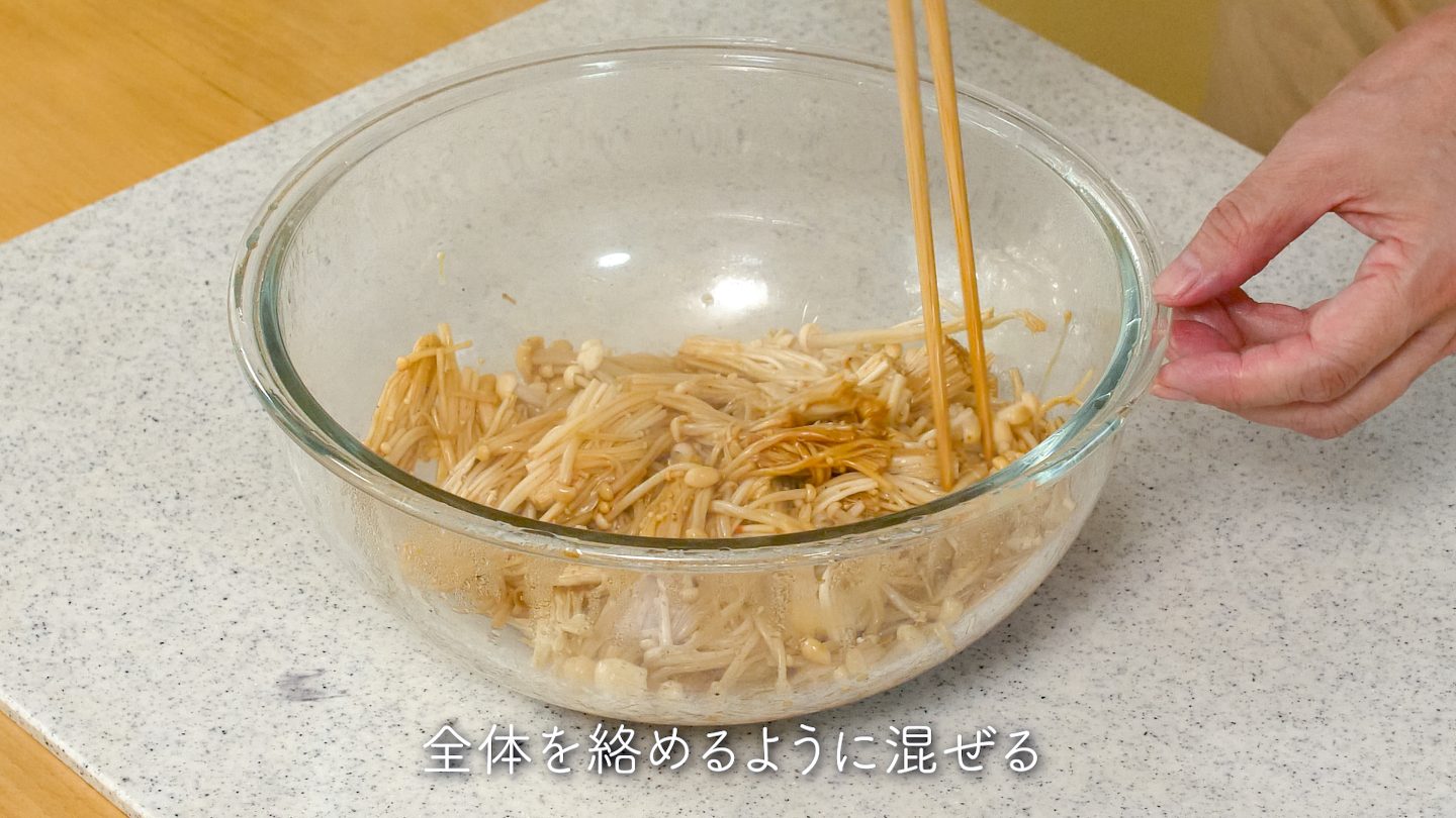 調味液にえのきだけを入れます。根本は手でほぐしながら入れ、全体を軽く混ぜ合わせましょう。