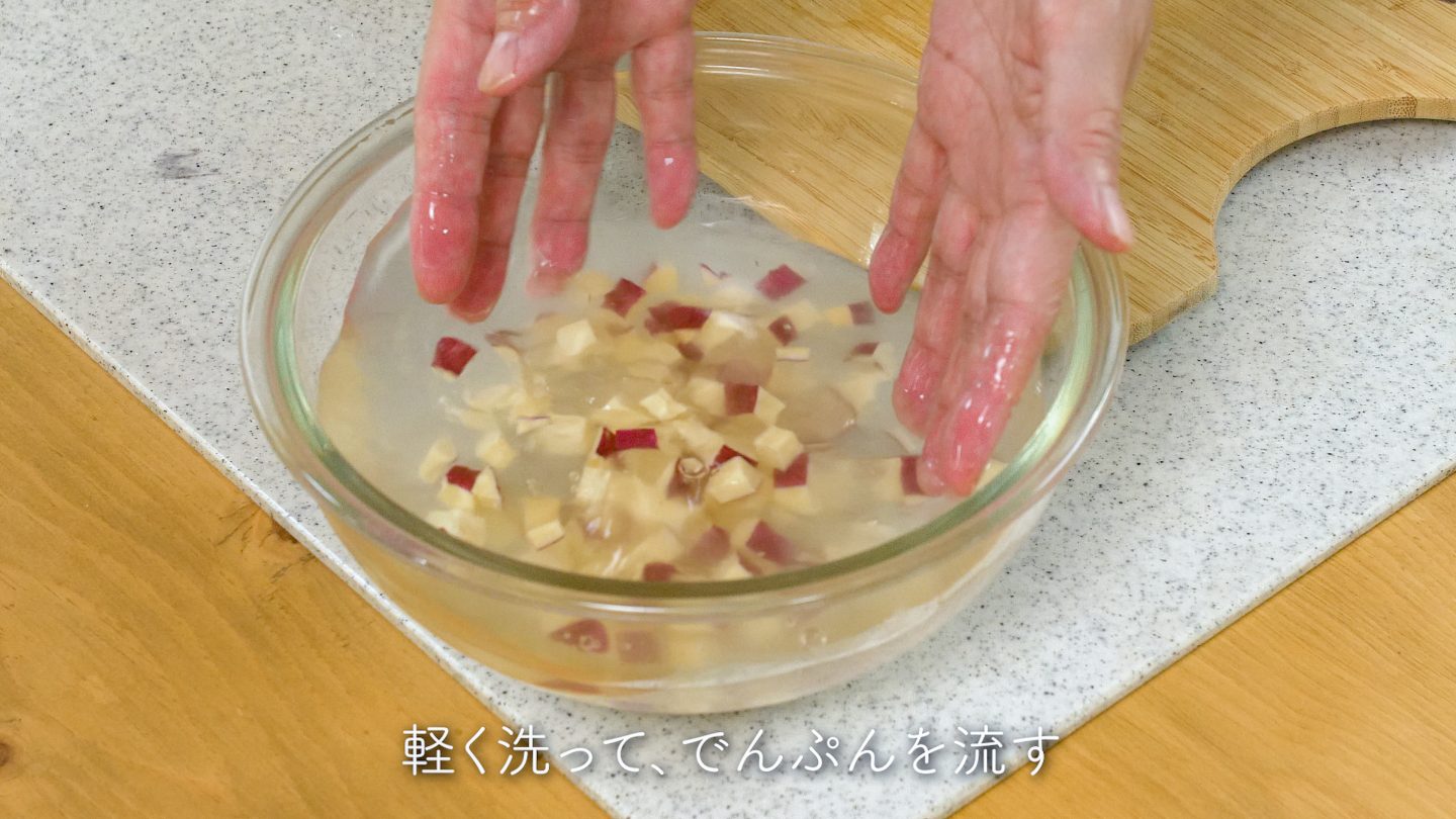 水を張ったボウルにさつまいもを入れ、軽く洗ってでんぷんを流します。