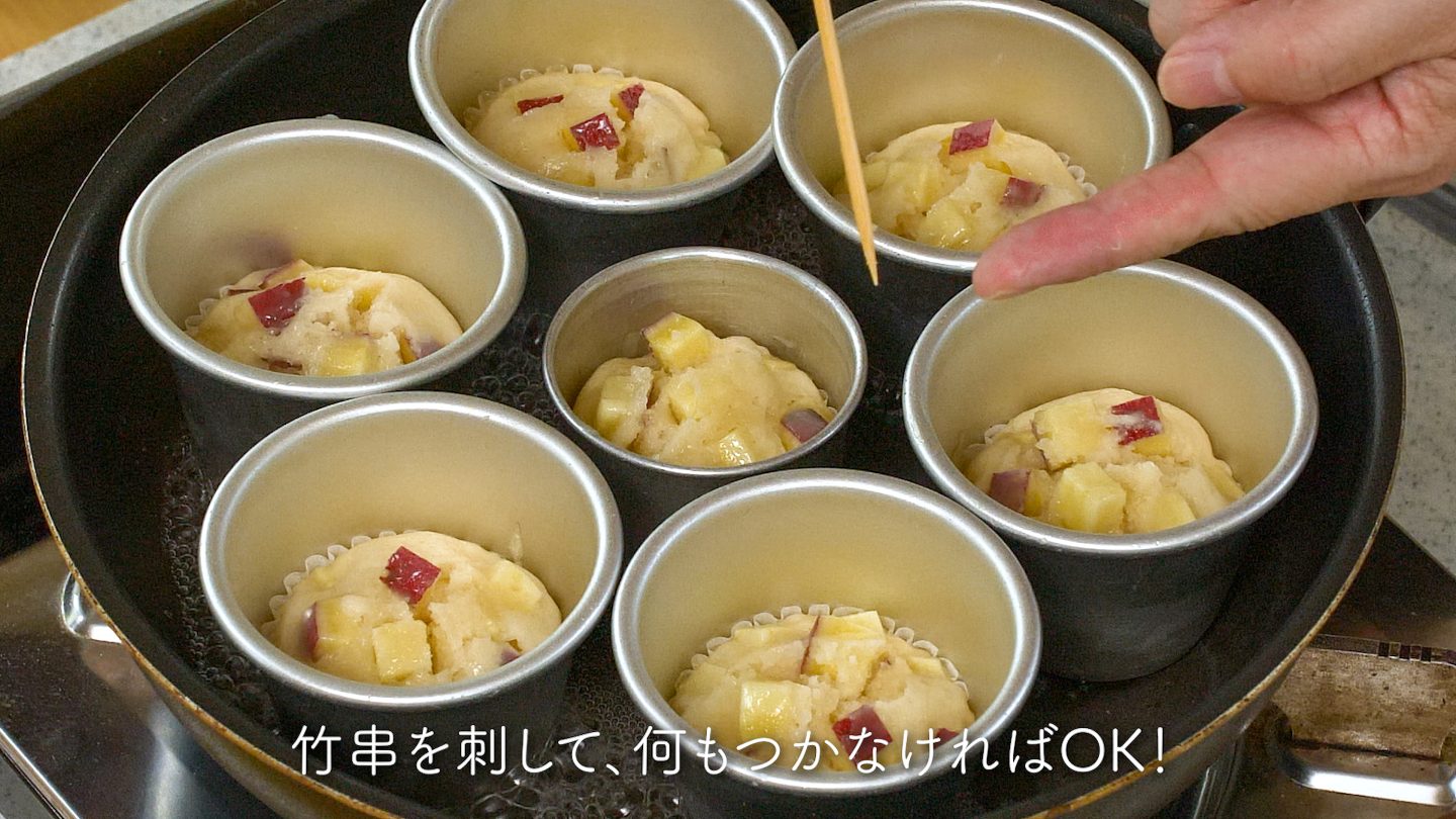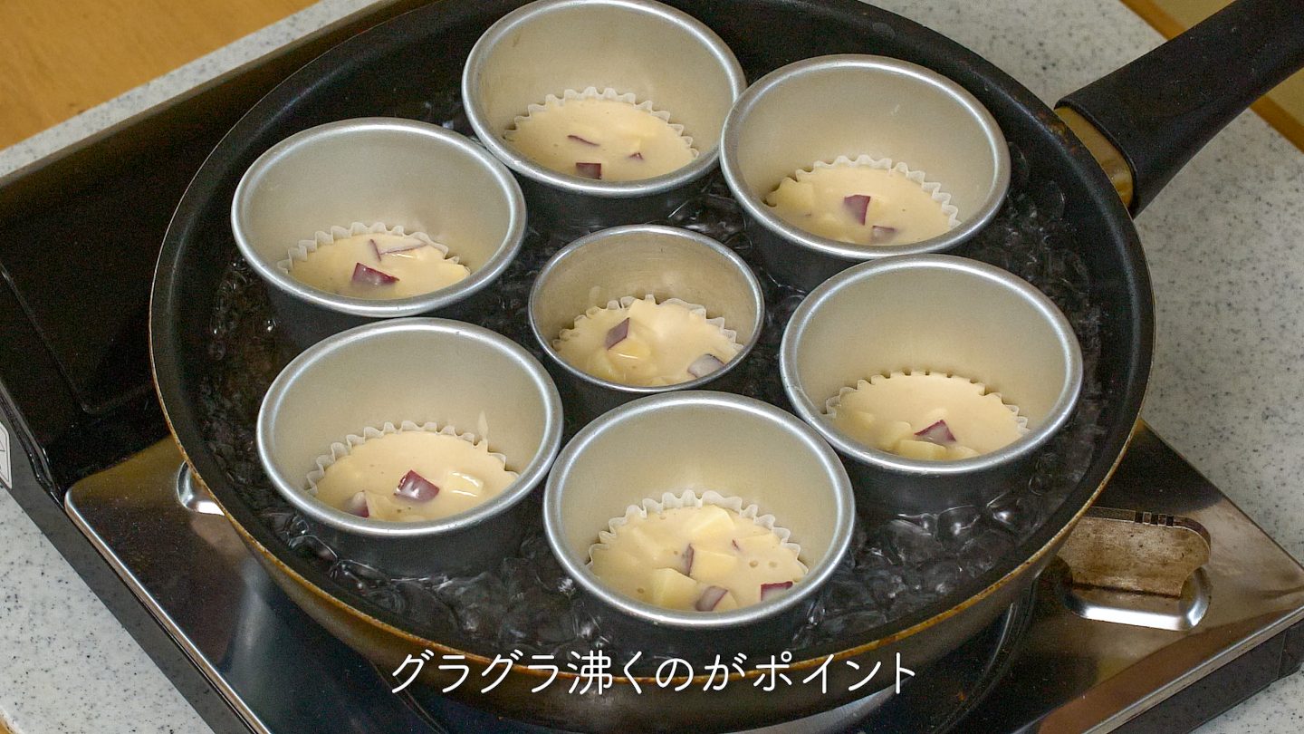 「今回は蒸し器がなくても作れるように、フライパンで蒸しあげます。ポイントは強火で一気に加熱すること。強い火力で蒸しあげると、蒸しパンの頭がパカッと割れて、きれいな花が咲きます。今回は小さいカップを使って、ミニサイズで作りました。食べやすい大きさなので、お弁当のおやつにもおすすめですよ」(以下「」内、沼津さん)