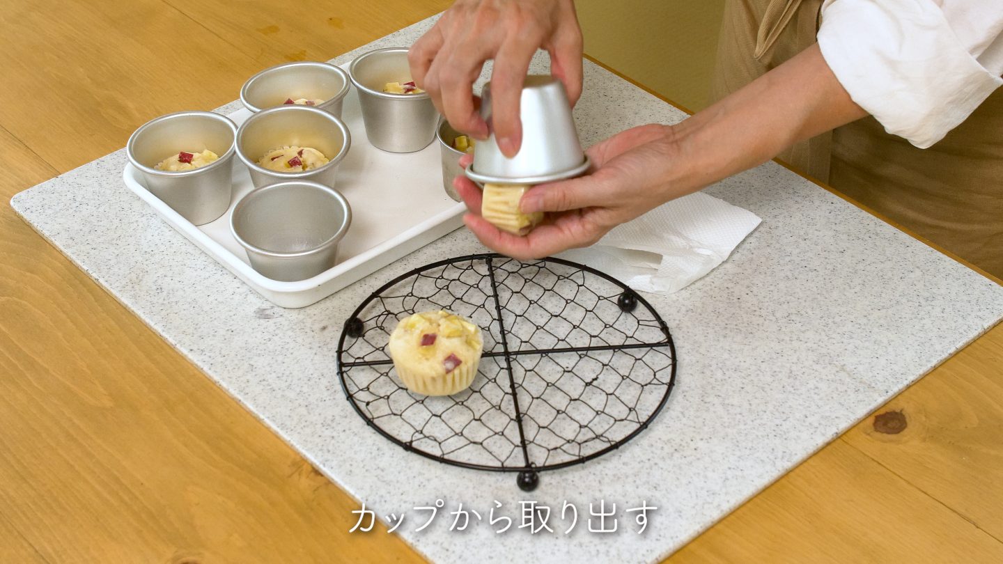 「カップから素早く出して、金網などにのせて冷ますと、蒸気が抜けてふわっと仕上がります。水気がこもらないので、長持ちしますよ」