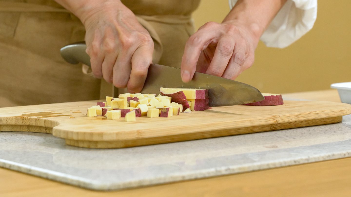 「さつまいもが大きいと火が通りにくいので、細かめに切りましょう。大きめの角切りにしたい時は、さつまいもを加熱してから加えてください」