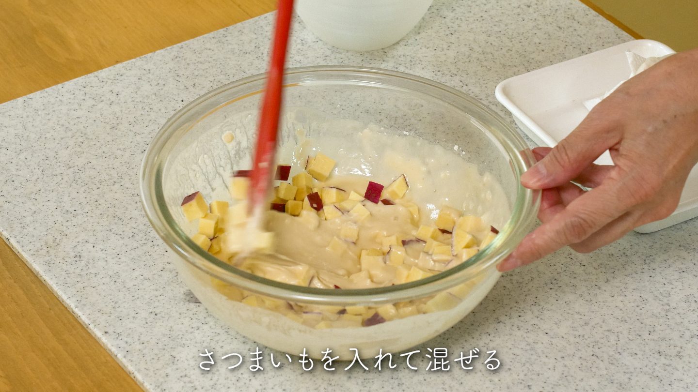 生地がよく混ざったら、水気を拭いたさつまいもを加えて、全体を混ぜ合わせます。さつまいもの水気はしっかり拭いてから入れてください。