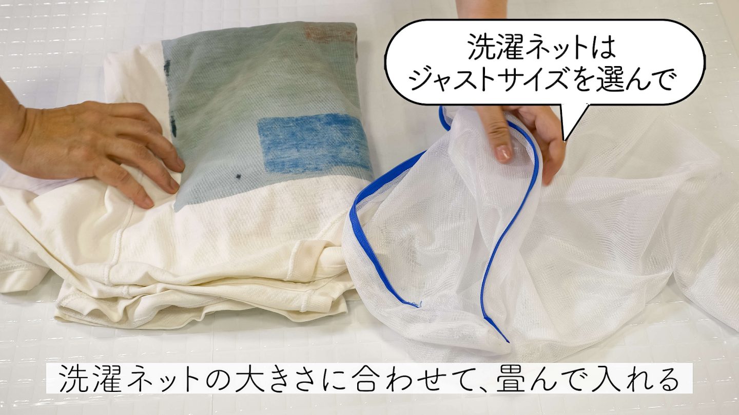 「Tシャツを入れる洗濯ネットは、ジャストサイズを選んだ方が、中でよれたり、動いたりしにくいので、優しく洗うことができますよ」