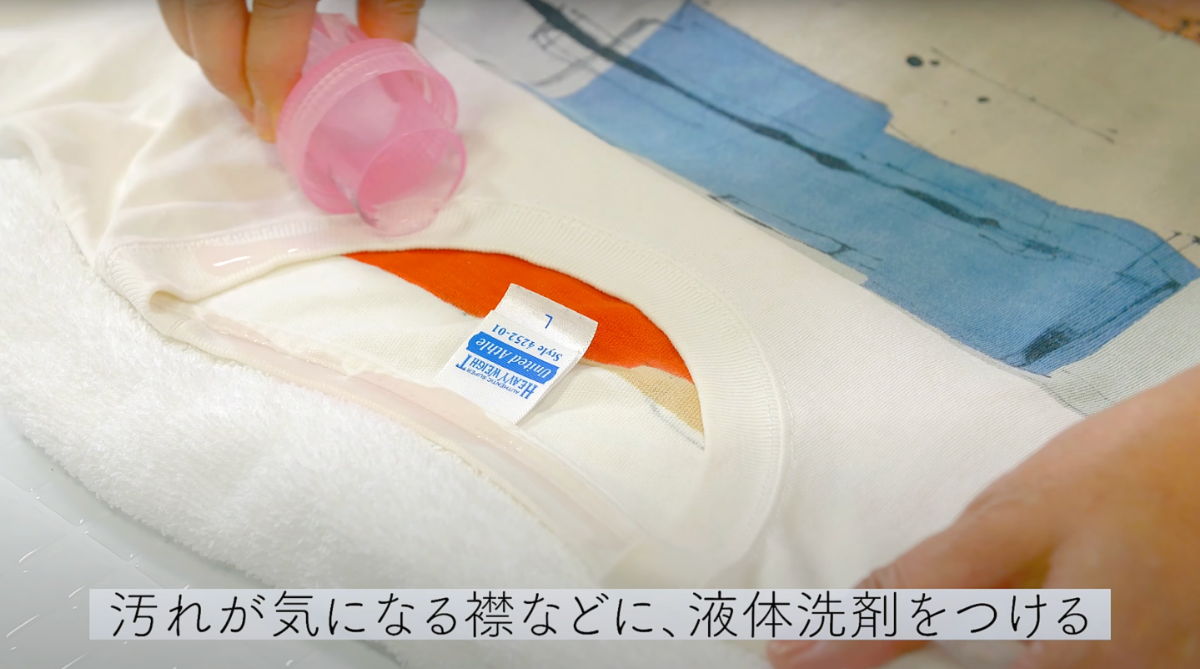 「汗や皮脂汚れが残ったままだと、黄ばみやニオイの原因になります。液体洗剤を直接塗布して、前処理をしておきましょう」