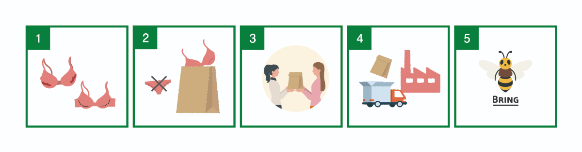 回収は、ワコールグループだけでなく他社製品もOK。回収したブラジャーは連携しているリサイクルプロジェクト「BRING™」でリサイクルされ、プラスチックの原料などに生まれかわります。