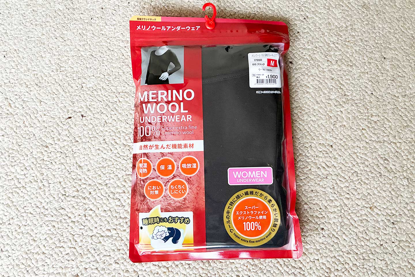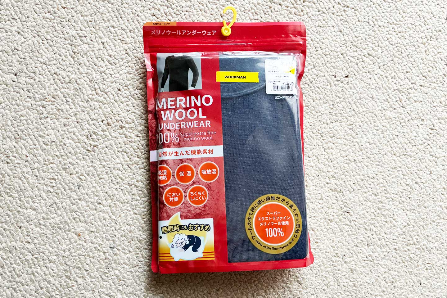 1,900円という価格で、スーパーエクストラファインメリノウール100%。