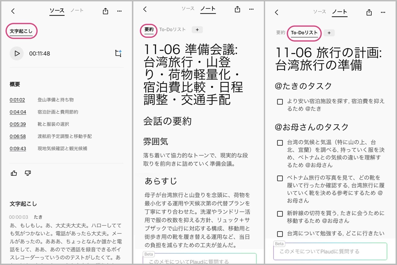 録音しておけば、面談後に「先生ってこう言ってたっけ?」「家で夫と共有したいのに忘れた」というモヤモヤも解消! 「Plaud Note Pro」なら、話した内容を要約してくれるため、家族への共有資料にもなります。
