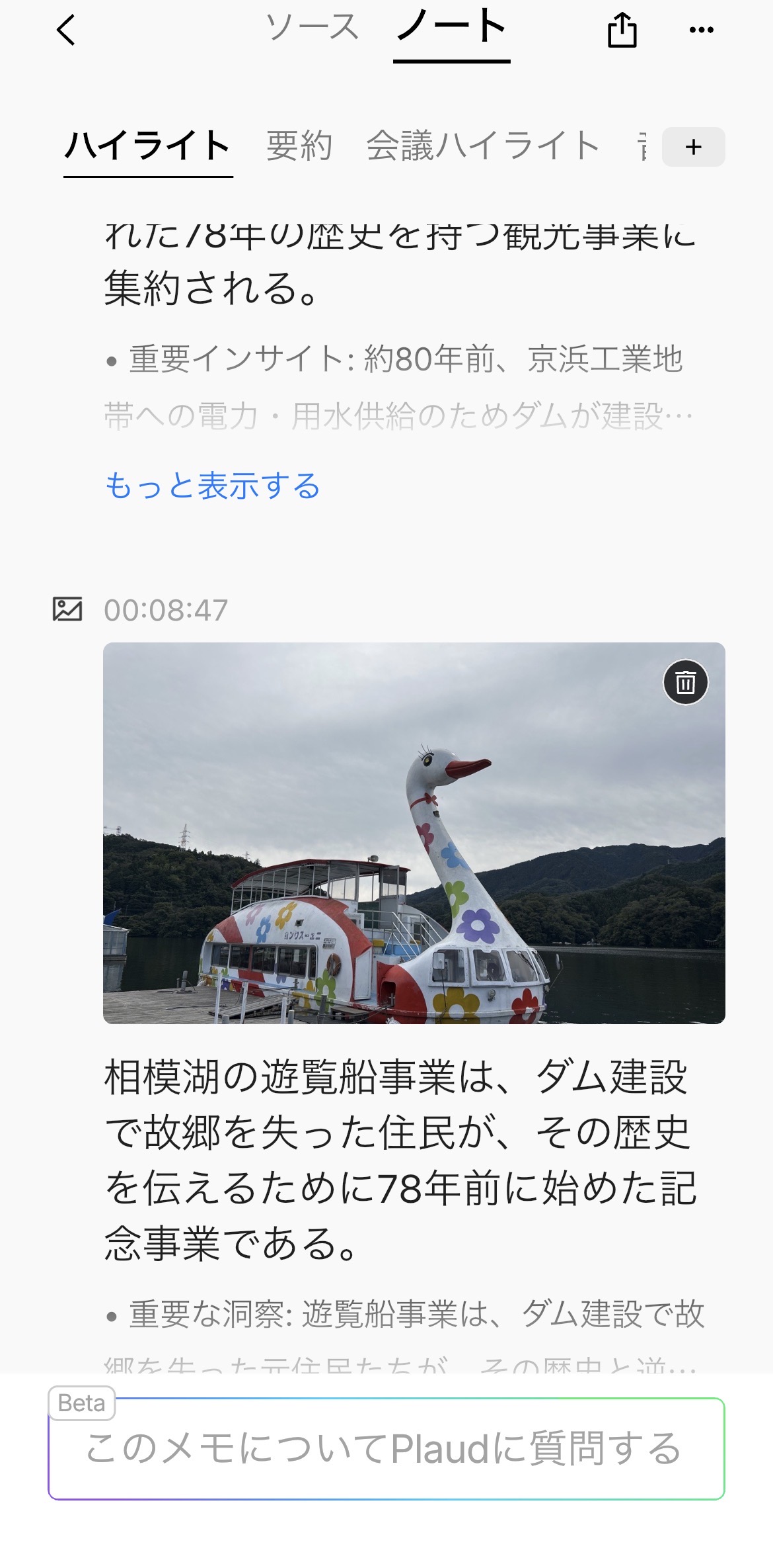 - 画像・メモの挿入機能:録音・書き起こしに加えて、会議中に撮った写真や手書きメモをアプリ上で併用できる。